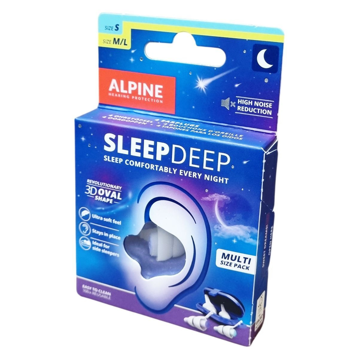 Az Alpine SleepDeep multipack ovális alakú, puha zajcsillapító maggal rendelkező füldugókat tartalmaz négy darabos kiszerelésben, amelyben két darab S, valamint két darab M/L méretű füldugó található. Az ovális forma a hallójárat természetes alakjához igazodik, így kényelmes viseletet és biztos tartást nyújt anélkül, hogy kiesne. A zajcsillapítás kiemelkedően hatékony, különösen horkolás esetén, az SNR érték 27 dB. A füldugó kivételesen puha anyaga ideálissá teszi az oldalunkon fekvők számára. Az újrafelhasználhatóság akár száz alkalommal is biztosított, így gazdaságos és környezetbarát választás. A termék szilikonmentes, könnyen tisztítható langyos szappanos vízzel, és minőségét korlátlan ideig megőrzi. A csomag praktikus tárolódobozt is tartalmaz, segítve a higiénikus tárolást. A termék FSC minősítéssel rendelkezik, mely támogatja a felelős erdőgazdálkodást.