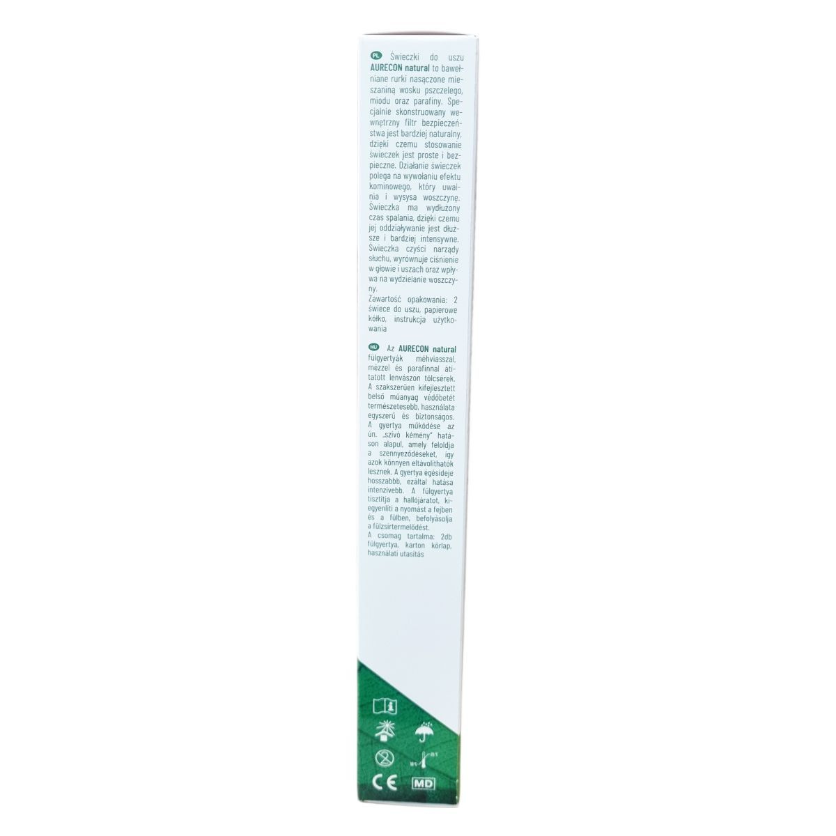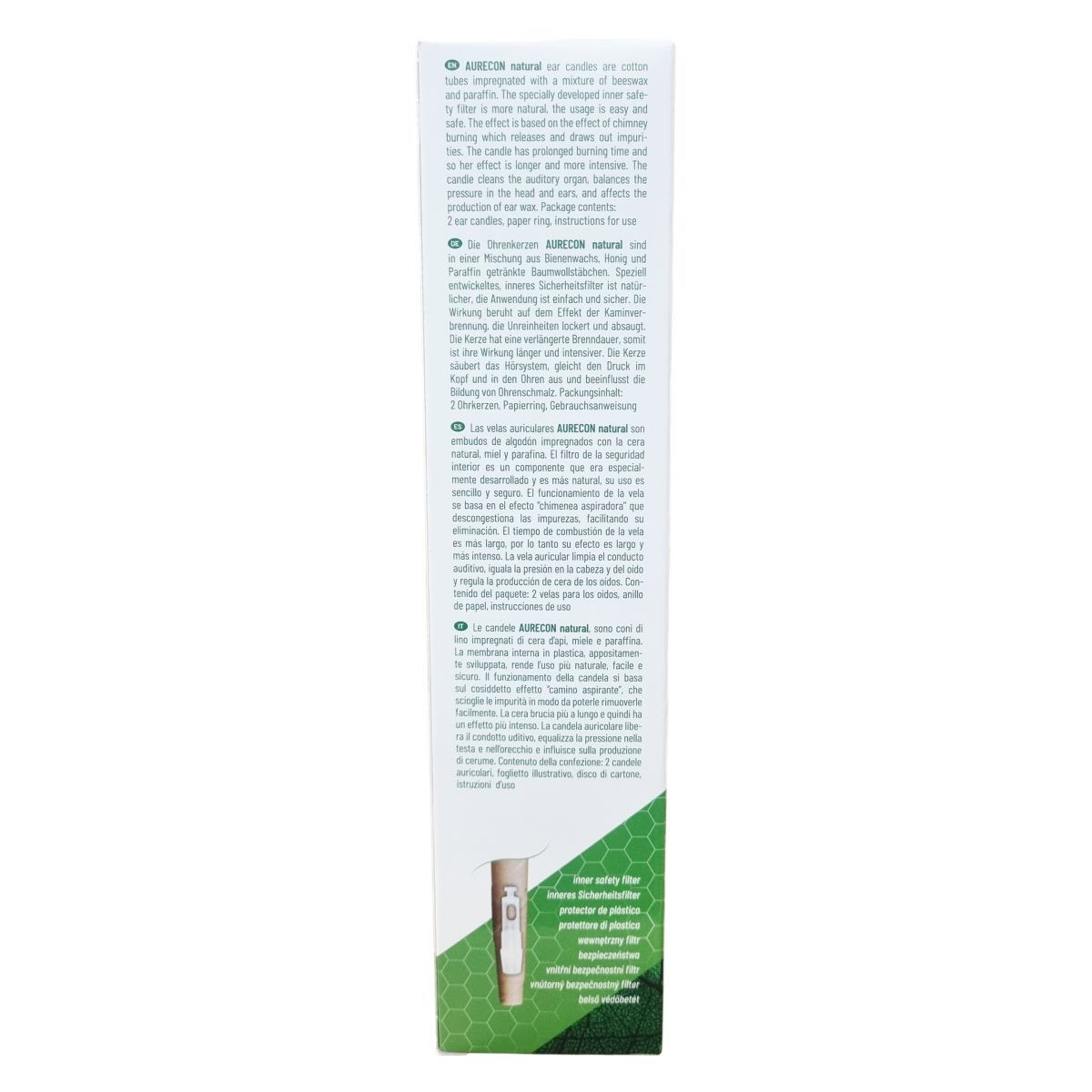 Az AURECON natural fülgyertyák pamutból készült tölcsérek, amelyeket méhviasz, méz és paraffin keverékével itattak át. A különlegesen kifejlesztett belső műanyag biztonsági szűrő növeli a természetességet, emellett biztonságossá és egyszerűvé teszi a használatot. A gyertya égési ideje hosszabb, így hatása intenzívebb és hosszabb ideig tart. A termék a kéményhatás elvén működik, amely segít az elszennyeződések oldásában és szívásában, tisztítja a hallószervet, kiegyenlíti a fej és a fül nyomását, valamint befolyásolja a fülzsír termelődését. A csomag két fülgyertyát, egy karton kört és használati útmutatót tartalmaz.
