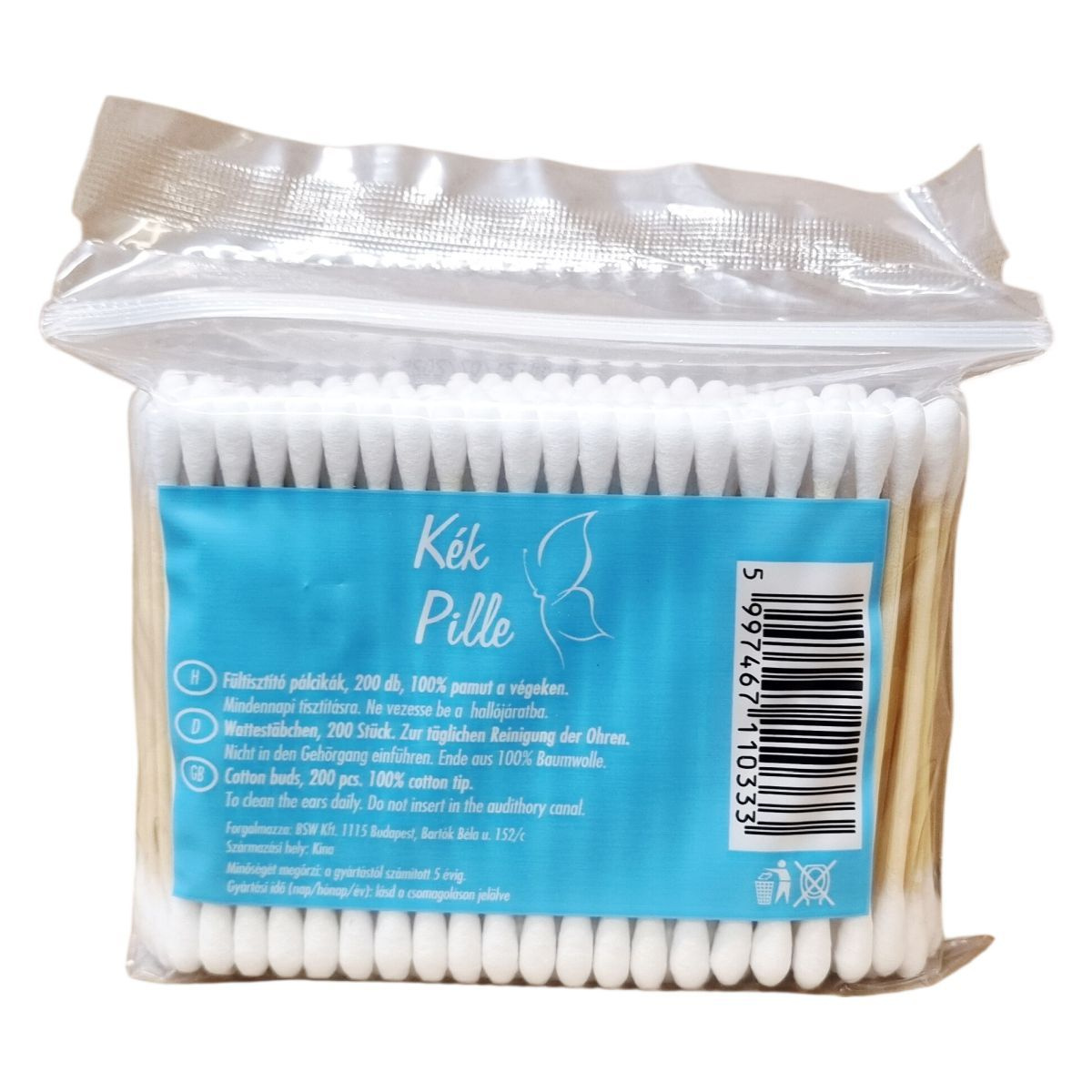 A Kék Pille fültisztító utántöltő 200 darab pálcikát tartalmaz, amelyek vége 100% pamutból készült. A termék Kínában gyártott és mindennapos fültisztításra készült, azonban nem szabad a hallójáratba bevezetni a biztonság érdekében. A termék a gyártástól számított 5 évig megőrzi minőségét. A gyártási idő a csomagoláson található megjelölés szerint olvasható. Termék vonalkódja: 5997467110333.