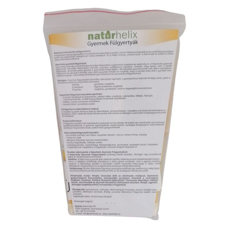 A Naturhelix gyermek fülgyertya három féle illatosítással (kamilla, propolisz, eukaliptusz) kapható, rövidebb ideig ég, átmérője pedig igazodik a gyerekek fülméretéhez. Mindemellett gyermekeknél csak akkor javasoljuk a fülgyertya használatát, ha képesek a kezelés ideje alatt nyugodtan feküdni és megértik, hogy a kezelés ideje alatt a fülgyertyát nem szabad megfogni. Három évesnél fiatalabb gyermekeknél nem javasoljuk a fülgyertyázást.