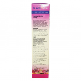 A Flavin 77 Kid szirup gyermekek számára készült különleges termék, amely 77 féle polifenolt és flavonoidot tartalmazó gyümölcsökből, virágokból, magvakból, gyógyfüvekből, fűszerekből, gyökerekből és levelekből álló szárított őrleményekből készül. A gyümölcsök között megtalálható többek között alma, bodza, fekete áfonya, homoktövis és vörösszőlő mag-héj is. A termék kakaóval, vaníliával és Omega 3,-6,-9 zsírsavakkal gazdagított, stevia édesítőszerrel készült szirup. Az összetétel részét képezi továbbá kendermagolaj és természetes aromaanyagok is. Felhívjuk a figyelmet arra, hogy a termék tartósítószert nem tartalmaz, ezért az erjedés elkerülése érdekében a tárolási és fogyasztási előírásokat pontosan be kell tartani. A szirup gyermekbarát ízesítéssel és összetétellel rendelkezik, mely a gyermeki szervezet támogatásában részesülhet.