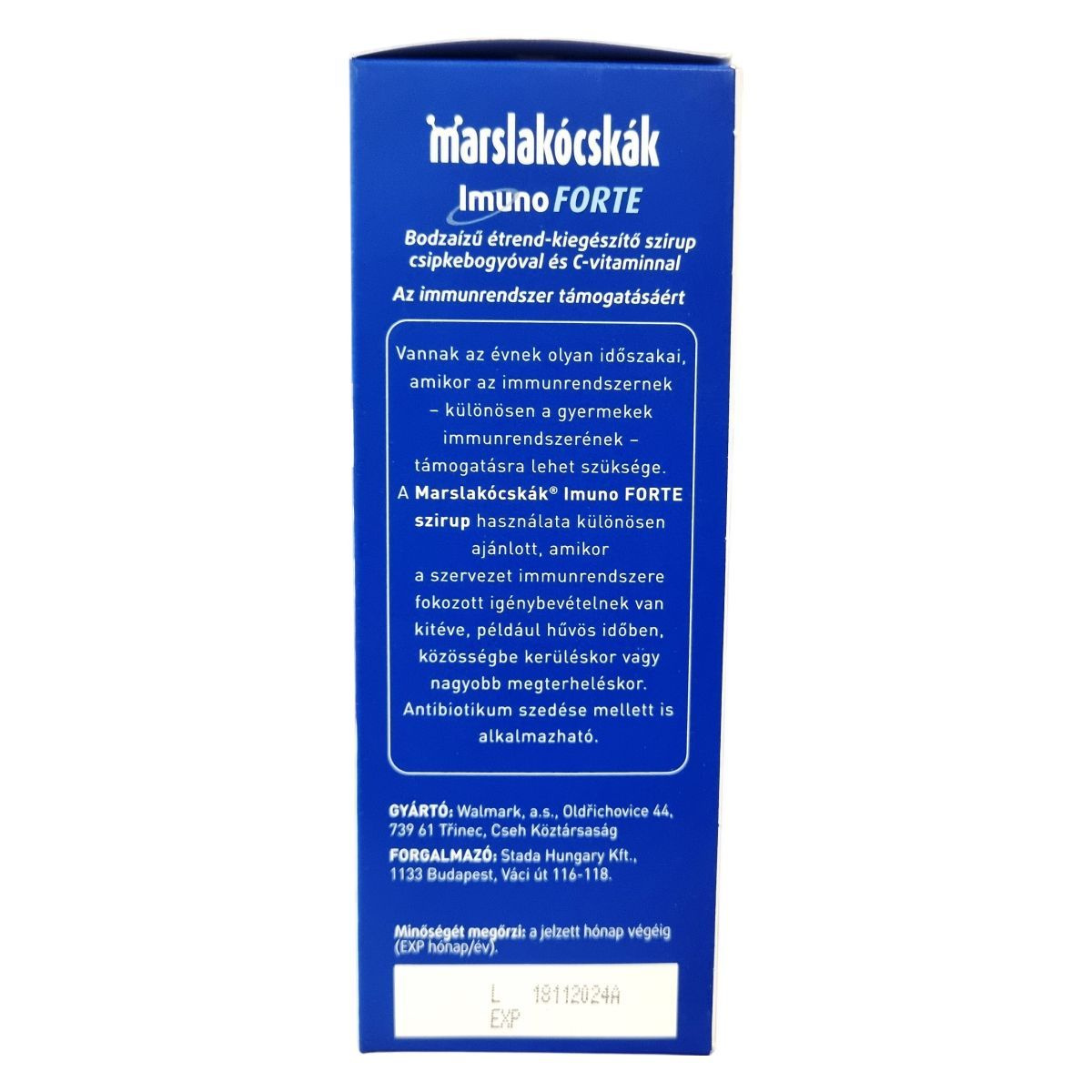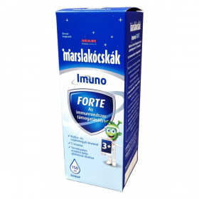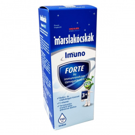 A Marslakócskák® Imuno FORTE bodzaízű étrend-kiegészítő szirup gyógynövény-kivonatokat, C-vitamint és természetes béta-glükánt tartalmaz. A fekete bodza (Sambucus nigra) hagyományos alkalmazása alapján hozzájárulhat a légutak és az immunrendszer megfelelő működéséhez. A csipkebogyó (Rosa canina) a sejtek oxidatív stresszel szembeni védelméhez, a szervezet védekezőképességének megfelelő működéséhez és a légutak egészségéhez támogató lehet. A szirup élesztőgombából származó béta-glükánt is tartalmaz, valamint C-vitamin forrása lehet, amely a normál immunműködéshez és sejtvédelemhez járulhat hozzá. Színezék- és tartósítószer-mentes termék, finom bodza ízzel.