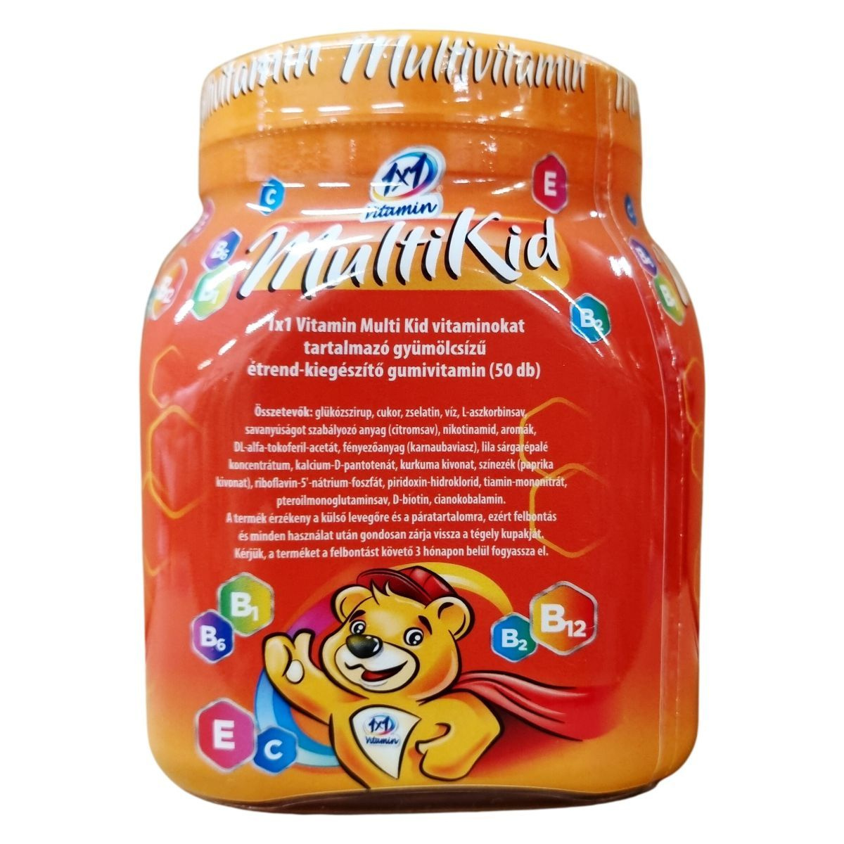 Az 1x1 Vitamin Multi Kid egy vitaminokat tartalmazó gyümölcsízű étrend-kiegészítő gumivitamin, amely 10 féle aktív összetevőt tartalmaz. A C- és E-vitamin hozzájárulhat a sejtek oxidatív stresszel szembeni védelméhez, míg a B6-, B12- és C-vitamin támogathatja az immunrendszer normál működését. A termék nettó tömege 225 g, ami 50 darab 4,5 grammos gumivitaminnak felel meg. Ez az étrend-kiegészítő különösen gyermekek számára készült, hogy a mindennapi vitaminbevitel megkönnyítésére szolgáljon. A termék származási helye az Európai Unió.