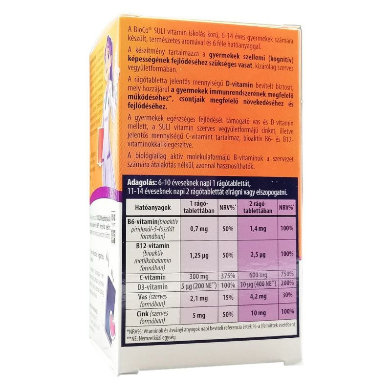 A BioCo SULI vitamin iskolás korú, 6–14 éves gyermekek számára készült, természetes aromával és többféle hatóanyaggal. Tartalmazza a gyermekek szellemi (kognitív) képességeinek fejlődéséhez szükséges vasat, kizárólag szerves vegyületformában. A rágótabletta jelentős mennyiségű D-vitamint biztosít, amely hozzájárulhat a gyermekek immunrendszerének megfelelő működéséhez, csontjaik megfelelő növekedéséhez és fejlődéséhez. A készítmény C-vitamin-, cink-, valamint bioaktív B6- és B12-vitamin-tartalommal egészül ki.