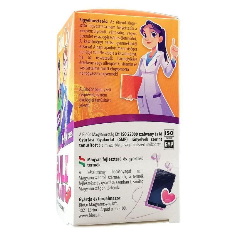 Gyermekek számára készült rágótabletta, amely vitaminokat és ásványi anyagokat tartalmaz, és hozzájárulhat az immunrendszer megfelelő működéséhez, a csontok növekedéséhez és a szellemi fejlődés támogatásához.