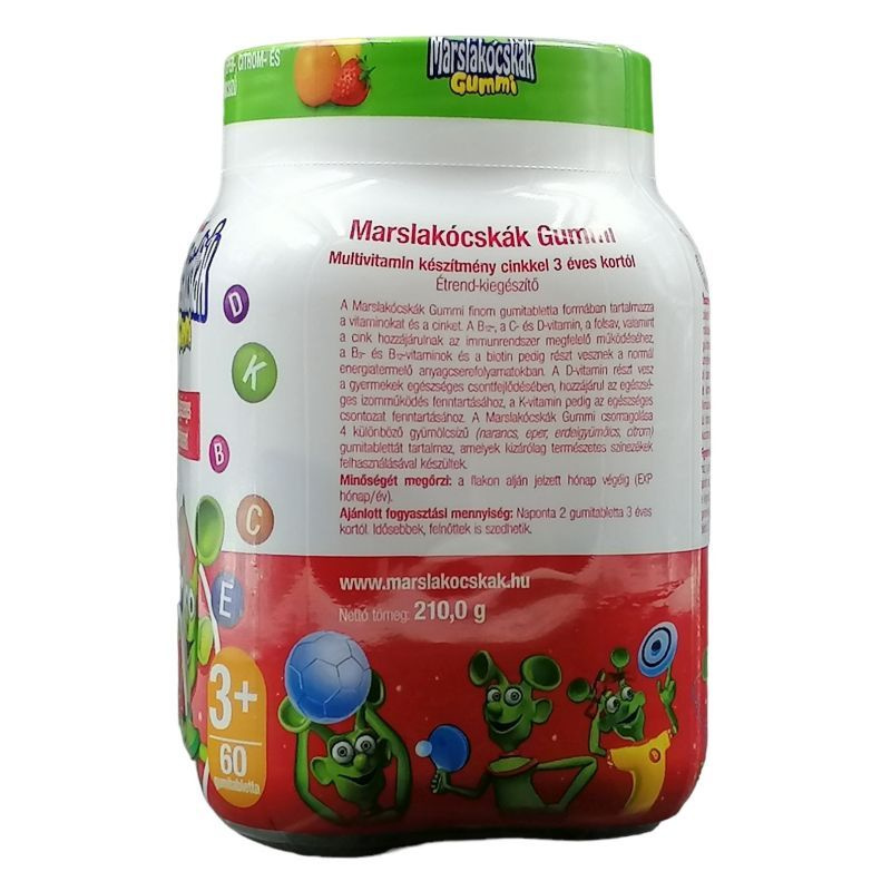 A Marslakócskák Gummi csomagolása 4 különböző gyümölcsízű (erdei gyümölcs, eper, citrom, narancs) gumitablettát tartalmaz, amelyek kizárólag természetes színezékek felhasználásával készültek. Különösen ajánljuk a sokat mozgó, sportoló és a növekedésben lévő gyermekeknek. Összetevők: napi adag (2 gumitabletta) tartalmaz: Csontaktív komplex: D3-vitamin: 5,0 μg, K-vitamin: 25,0 μg, B3-vitamin: 16,0 mg, B5-vitamin: 6,0 mg, B12-vitamin: 2,5 μg, C-vitamin: 80,0 mg, E-vitamin: 12,0 mg, folsav: 200,0 μg, biotin: 50,0 μg, cink: 10,0 mg. További összetevők: glukóz szirup, szacharóz, zselatin, víz, L-aszkorbinsav, savanyúságot szabályozó (citromsav), DL-alfa-tokoferol-acetát, aromák (eper-, erdei gyümölcs-, narancs- és citrom aroma), víz, maltodextrin, cink-citrát, színezékek (orvosi szén és kékszőlő-kivonat (erdei gyümölcs ízű tablettában), kármin (eper ízű), kurkumin, spenót-, csalán- és kurkuma kivonat (citromízű), paprika-kivonat (narancsízű)), nikotinamid, fényező anyag (növényi olaj, méhviasz, karnauba viasz), kalcium-D-pantotenát, kolekalciferol, fitomenadion, folsav, D-biotin, cianokobalamin. Adagolás: naponta 2 gumitabletta 3 éves kortól. Idősebbek, felnőttek is szedhetik.
