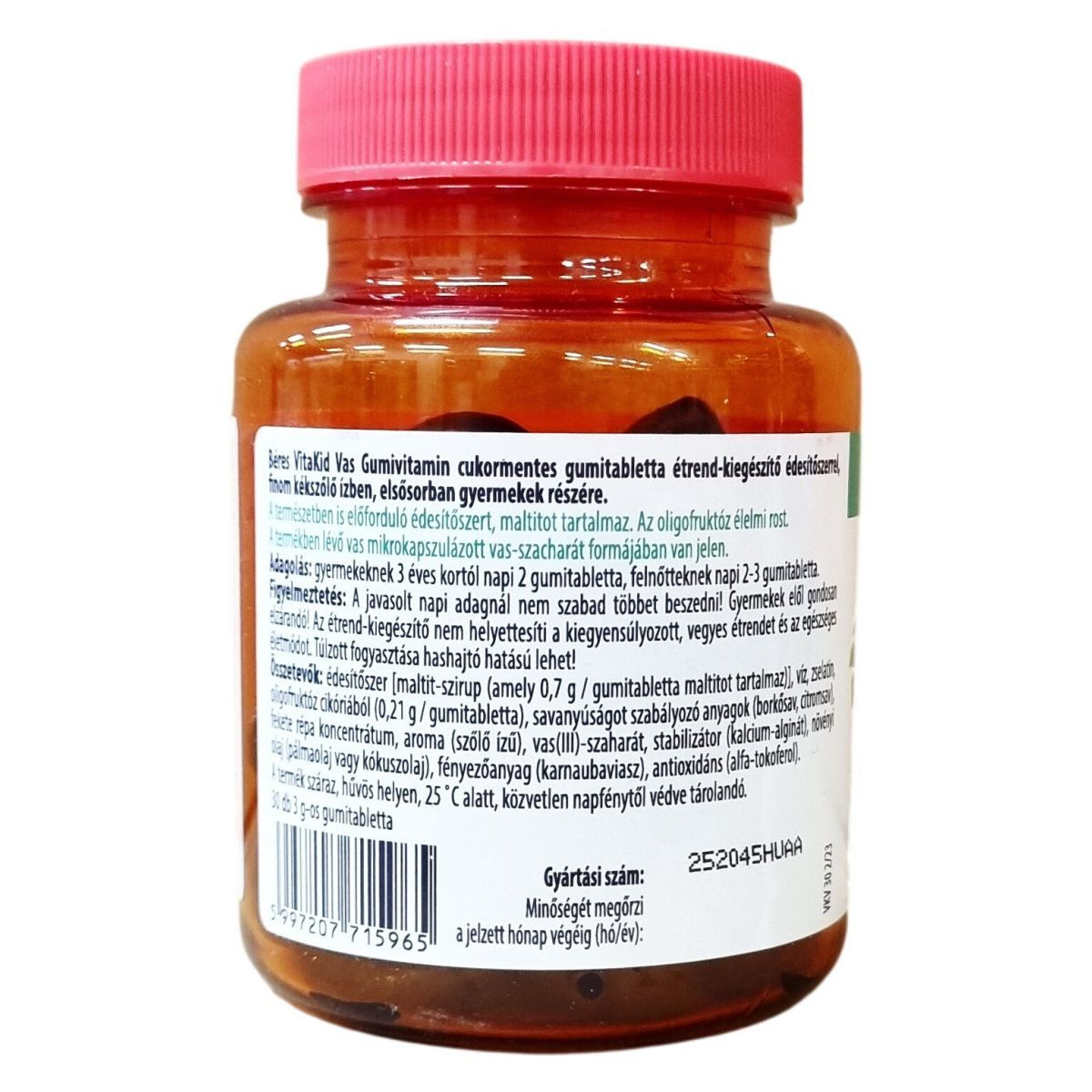 A termék felnőttekre vonatkozó napi beviteli referenciaérték százalékában (NRV) 2 gumitabletta 78% vasat, míg 3 gumitabletta 118% vasat tartalmaz. A vas elősegítheti a normál vörösvérsejt- és hemoglobin-képződést, támogatva ezáltal a szervezet megfelelő működését. A gumivitamin cukortartalma 100 g termékben kevesebb, mint 0,5 g, így cukormentesnek minősül.