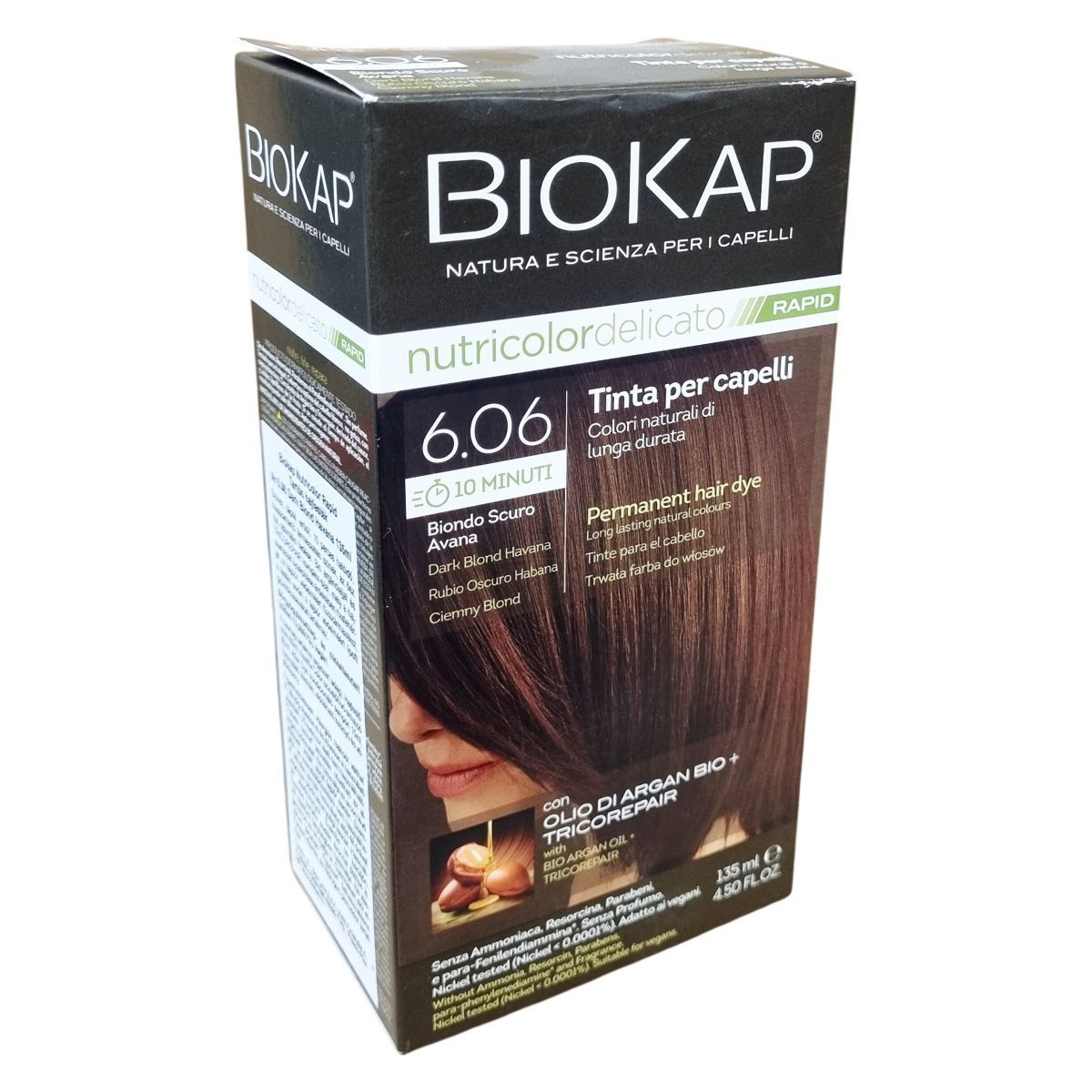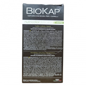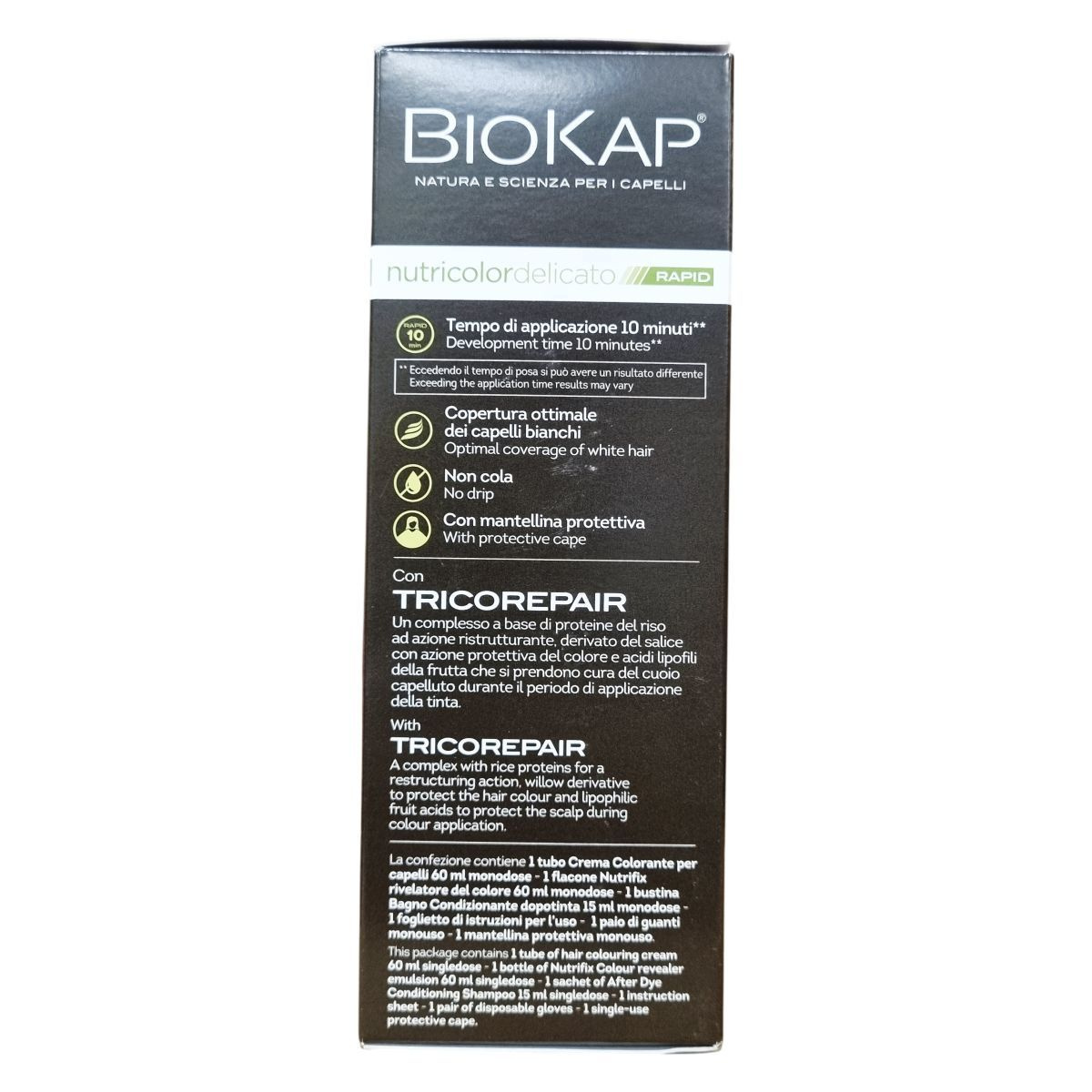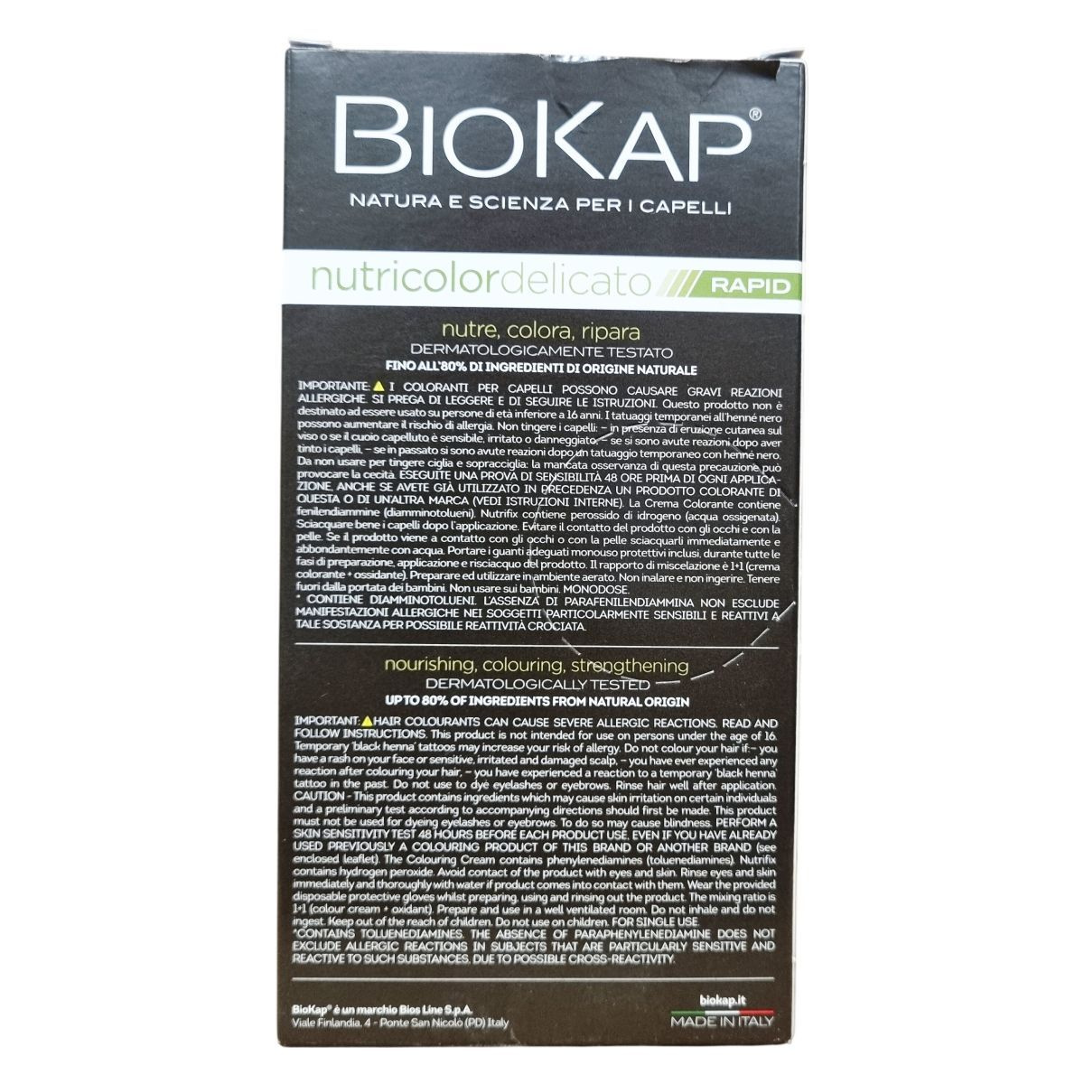 A BioKap Nutricolor Delicato Rapid hajfesték a természet és a tudomány találkozása a hajápolásban. Hatékonyan táplál, színez és erősít a rövid, 10 perces hatóidő alatt, miközben akár 80%-ban természetes eredetű összetevőkből áll. Különleges TRICOREPAIR komplexe rizsfehérjéből, fűzfa kivonatból és gyümölcssavakból áll, amelyek hozzájárulnak a haj szerkezetének újjáépítéséhez és a fejbőr védelméhez a festés alatt. A termék ammónia, resorcin, parabének, para-feniléndiamin és illatanyag nélkül készült, nikkeltesztelt (nikkel tartalom < 0,0001%) és vegánok számára is megfelelő. A csomagban külön egységcsomagolt hajfestő krém, színelőhívó emulzió, hajfestést követő kondicionáló sampon, használati utasítás, eldobható kesztyű és védőkörny található, így garantálja a biztonságos és kényelmes használatot. A terméket jól szellőző helyiségben kell alkalmazni, és figyelembe kell venni a maximális hatóidőt, mert annak túllépése eltérő eredményt okozhat. A termék kizárólag egyszeri használatra készült, és tartalmaz feniléndiamint és hidrogén-peroxidot, ezért fokozott óvatosság szükséges a használat során.