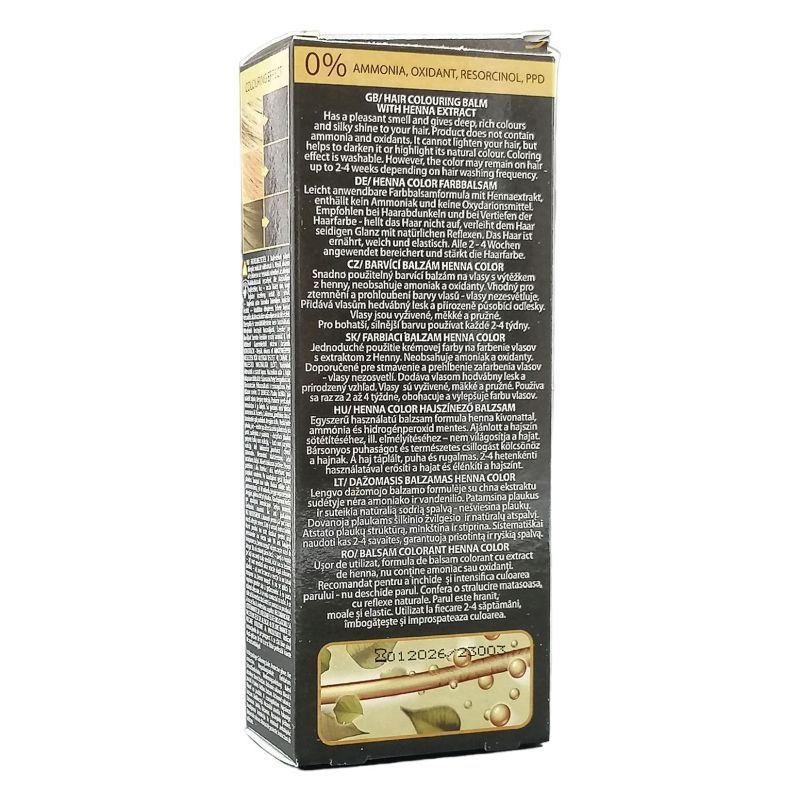 Ragyogó színt biztosít, mely 6-8 mosásig megmarad. Könnyű a felvitele közvetlenül a tubusból. Intenzív hajápolás, köszönhetően a henna kivonatnak. Széles színválaszték. A csomag tartalma: Tubus színező krémmel, használati útmutató, védőkesztyű.