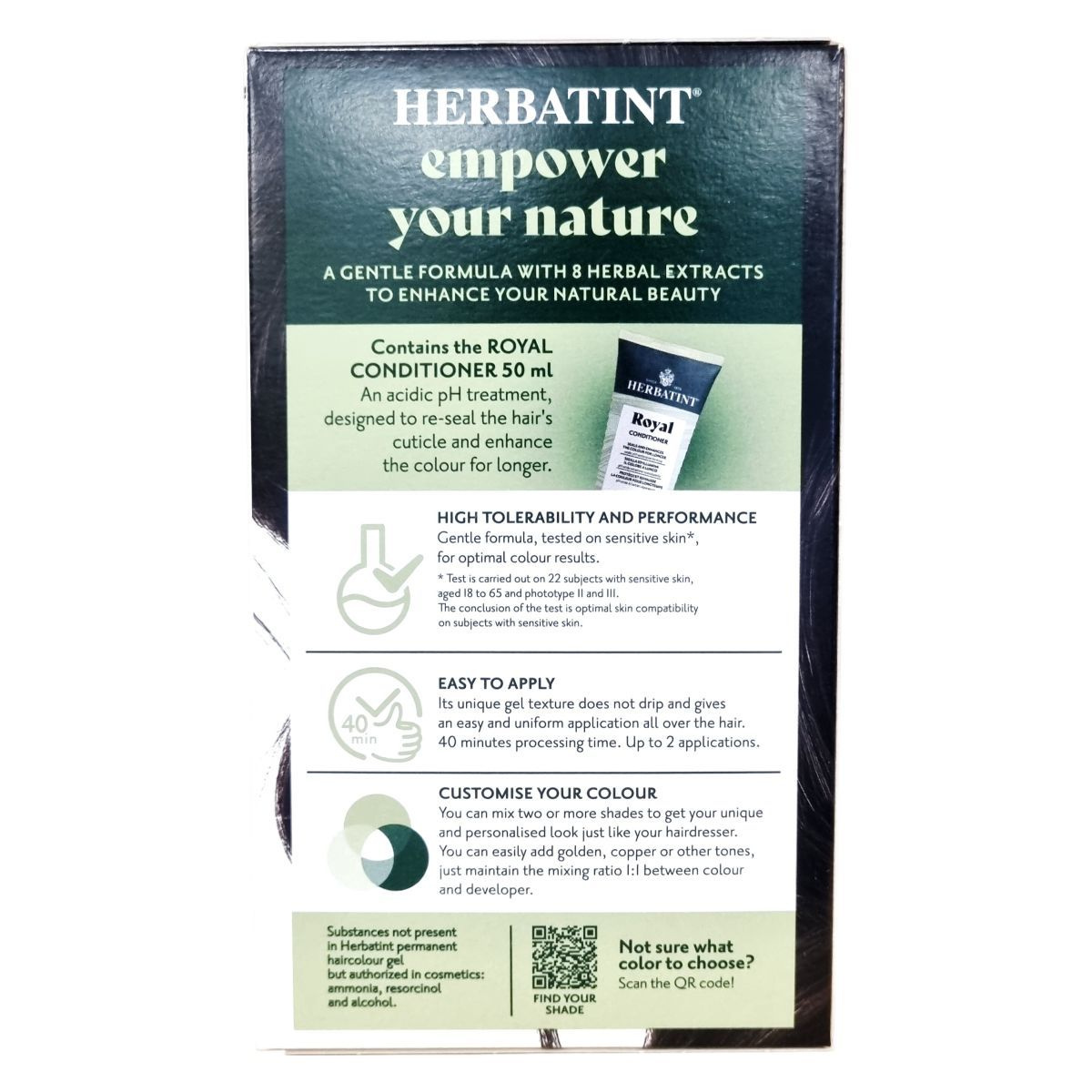 A Herbatint permanent haircolour gel egy gél állagú, csepegésmentes hajfesték, amely egyenletes felvitelt biztosít. A csomag tartalmaz egy 60 ml-es hajfestéket, egy 60 ml-es előhívót, egy 50 ml-es Royal Conditioner kondicionálót és egy pár kesztyűt. A Royal Conditioner savas pH-jú kezelés, amely segít a haj kutikulájának visszazárásában és a szín tartósságának növelésében. A feldolgozási idő 40 perc, a termék akár két alkalommal is felhasználható.