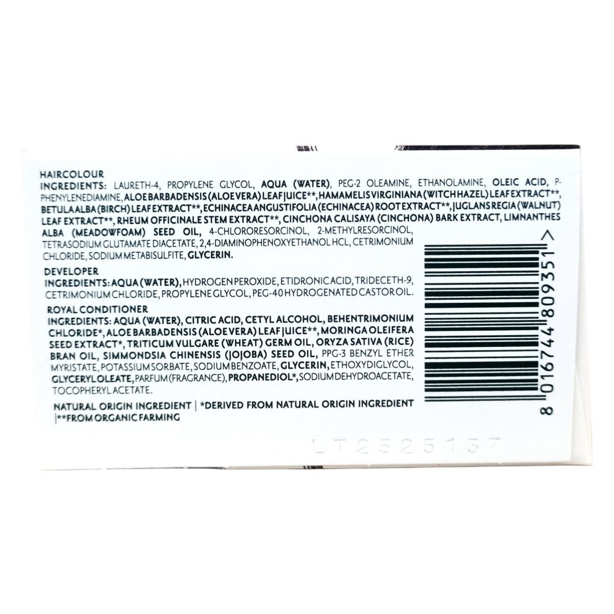 Hajfesték: Laureth-4, Propylene Glycol, Aqua (Water), PEG-2 Oleamine, Ethanolamine, Oleic Acid, P-Phenylenediamine, Aloe Barbadensis Leaf Juice, Hamamelis Virginiana Leaf Extract, Betula Alba Leaf Extract, Echinacea Angustifolia Root Extract, Juglans Regia Leaf Extract, Rheum Officinale Stem Extract, Cinchona Calisaya Bark Extract, Limnanthes Alba Seed Oil, 2-Amino-3-Hydroxypyridine, P-Aminophenol, Tetrasodium Glutamate Diacetate, 4-Chlororesorcinol, P-Methylaminophenol Sulfate, Cetrimonium Chloride, Sodium Metabisulfite, Glycerin.
