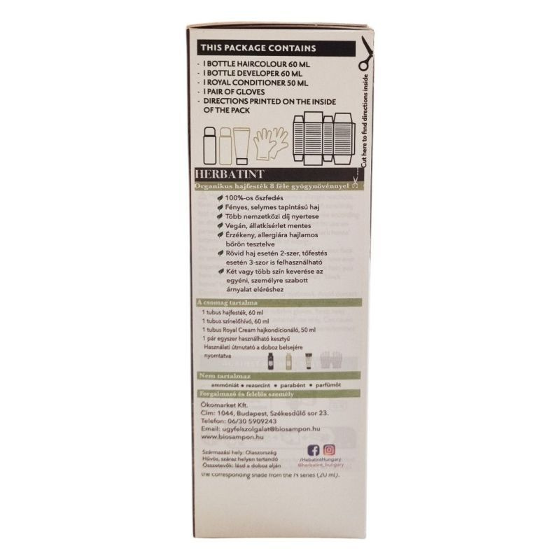 A Herbatint permanent haircolour gel egy gél állagú, csepegésmentes hajfesték, amely egyenletes felvitelt biztosít. A csomag tartalmaz egy 60 ml-es hajfestéket, egy 60 ml-es előhívót, egy 50 ml-es Royal Conditioner kondicionálót és egy pár kesztyűt. A Royal Conditioner savas pH-jú kezelés, amely segít a haj kutikulájának visszazárásában és a szín tartósságának növelésében. A feldolgozási idő 40 perc, a termék akár két alkalommal is felhasználható.