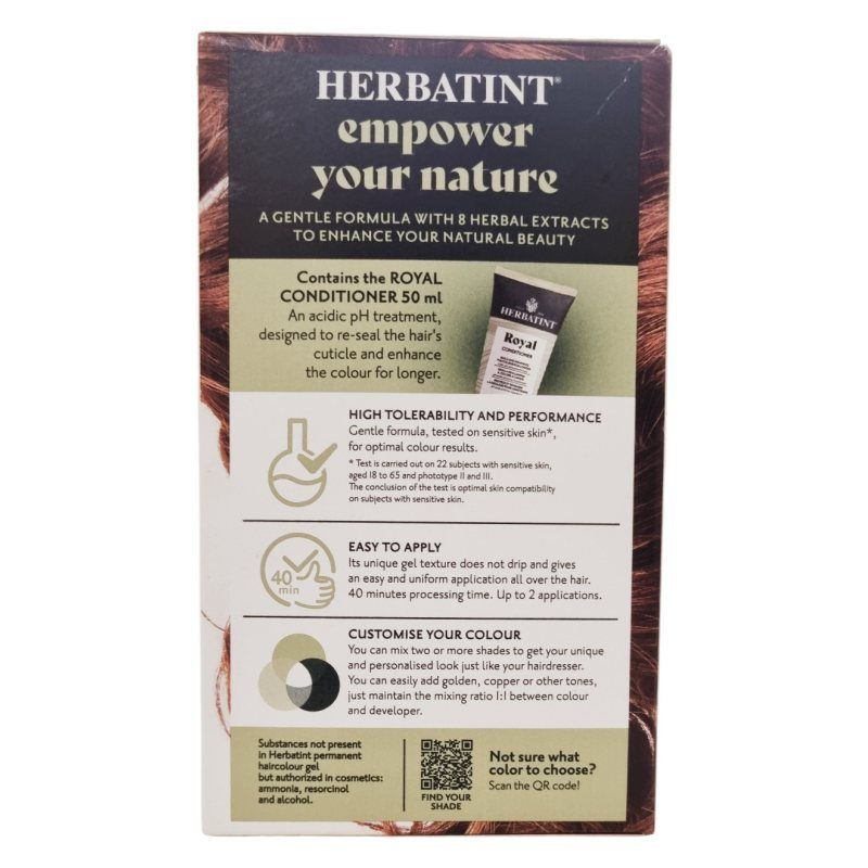 A Herbatint permanent haircolour gel egy gél állagú, csepegésmentes hajfesték, amely egyenletes felvitelt biztosít. A csomag tartalmaz egy 60 ml-es hajfestéket, egy 60 ml-es előhívót, egy 50 ml-es Royal Conditioner kondicionálót és egy pár kesztyűt. A Royal Conditioner savas pH-jú kezelés, amely segít a haj kutikulájának visszazárásában és a szín tartósságának növelésében. A feldolgozási idő 40 perc, a termék akár két alkalommal is felhasználható.