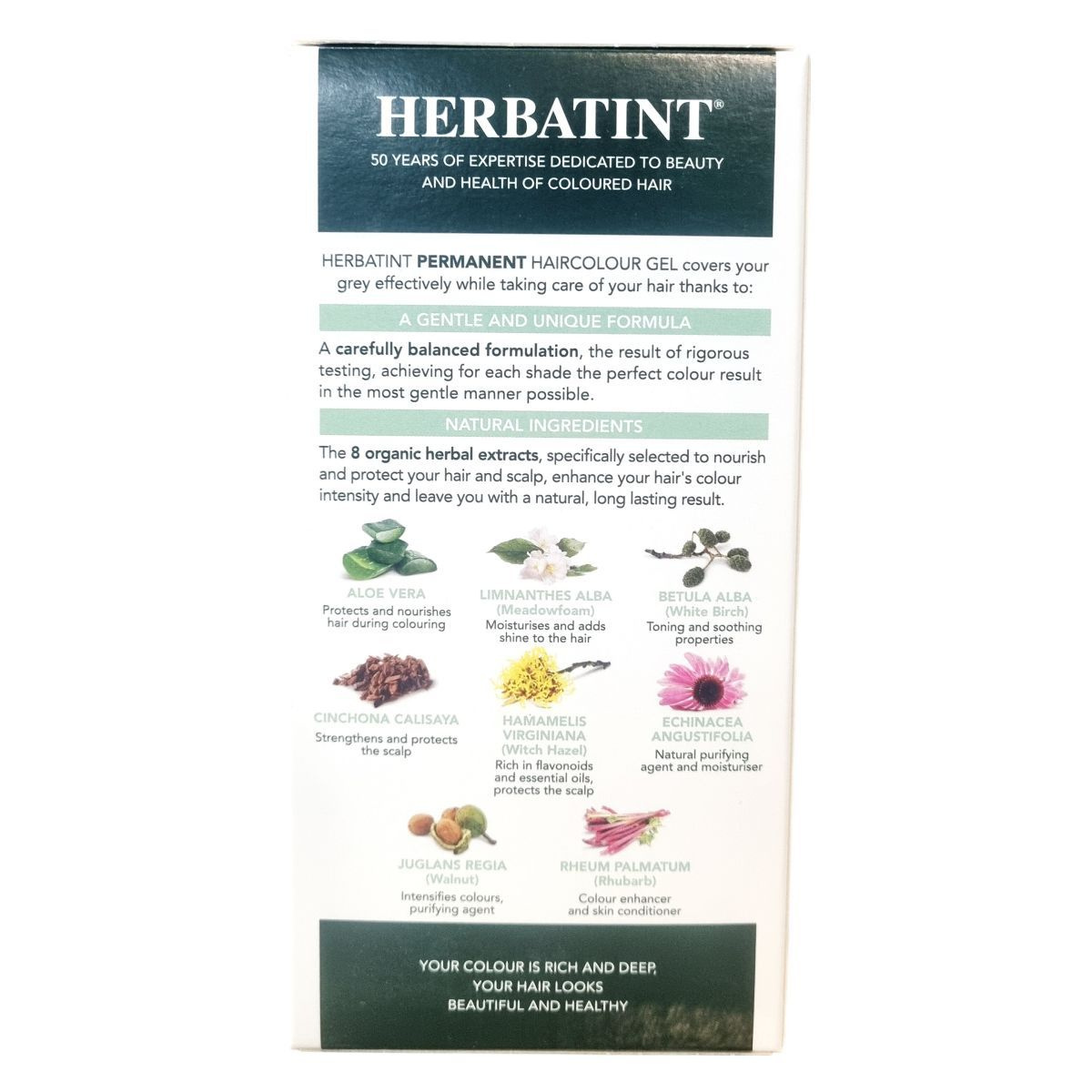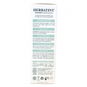 A HERBATINT tartós hajfesték gél 50 év szakértelmével és elkötelezettségével készült, kíméletes formulával, amely már az első alkalmazásnál tökéletesen fed. A termék hatóanyagai táplálják és védik a hajat és a fejbőrt, természetes és egészséges fényt adva a hajnak. Az 36 árnyalatból választható, amelyeket akár keveréssel is testre szabhat. A gél alapú hajfesték könnyen keverhető és felszívódása kellemes, szagtalan élményt biztosít. A felhasználatlan keverék eltartható későbbi alkalmazásra is. A csomag egy tubus hajfestéket (60 ml), egy tubus színelőhívót (60 ml), egy tubus Royal Cream hajkondicionálót (50 ml) és egy pár egyszer használatos kesztyűt tartalmaz, valamint részletes használati útmutatót. A termék nem tartalmaz ammóniát, rezorcint, parabéneket, alkoholt és parfümöt, valamint FSC tanúsított csomagolásban kapható, amely támogatja a felelős erdőgazdálkodást.