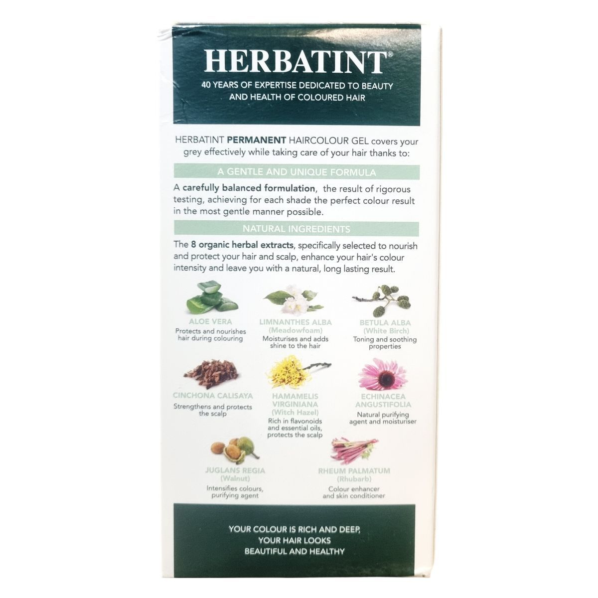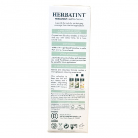 A HERBATINT permanens hajfesték gél egy kíméletes, természetes alapú formula, amely 100%-os őszfedést biztosít első alkalommal is. A 8 válogatott gyógynövénykivonat ápolja és védi a hajat és a fejbőrt, táplálva és fokozva a hajszín intenzitását. A termék ammóniamentes, parabénmentes, alkohol- és illatanyagmentes, így érzékeny bőrűek számára is megfelelő. A csomag tartalmaz egy 60 ml hajfesték gélt, 60 ml színélhívó folyadékot, 15 ml Normalizáló sampont, 15 ml Aloe Vera Royal krém balzsamot, kesztyűt és használati útmutatót. A hajfesték keverési aránya 1:1 a developerrel. A termék akár két alkalomra is elegendő rövid haj esetén, a maradékot visszazárva tárolhatjuk további használatra. Az élénk és tartós színt egyedivé tehetjük a 36 különböző árnyalatból választva vagy azokat keverve. A HERBATINT a természetességet és a haj egészségét helyezi előtérbe, elősegítve a fényes, egészséges megjelenést, miközben környezetbarát csomagolásban érkezik, támogatva az állatkísérlet-mentességet és a fenntartható erdőgazdálkodást.