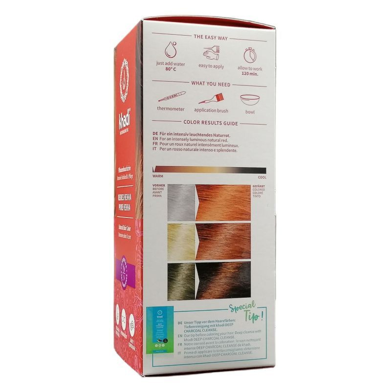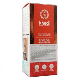 Ez a Khadi Henna por a hajat a narancssárga és vörös árnyalataira festi. Az új hajszín eredménye nagymértékben függ a kiinduló hajszíntől. A Henna por a világos szőke hajat sárgarépa vörösre, a barna hajat mahagóni színűre festi. Teltséget és fényt biztosít. A henna természetes színező más növényi porokkal keverhető.