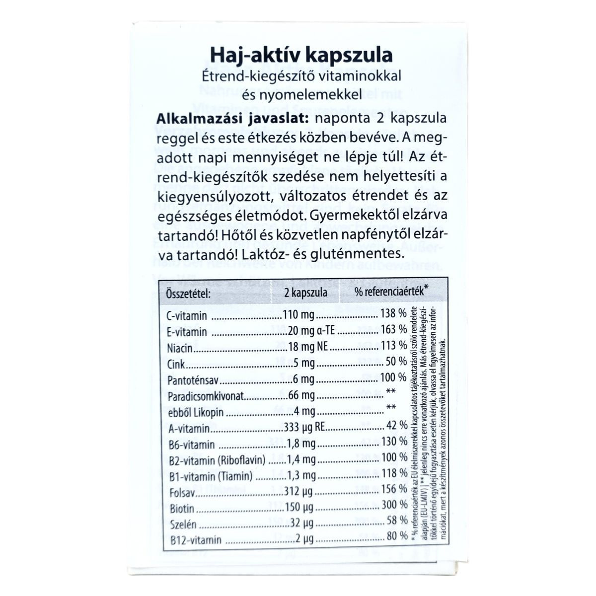 A haj-aktív kapszula egy kiegyensúlyozott formula vitaminokkal, nyomelemekkel és értékes növényi kivonatokkal, melyek hozzájárulhatnak a haj egészségéhez, valamint a fejbőr állapotának javításához. A benne található biotin és cink támogatják a hajhagymák és a fejbőr vitalitását, míg a szelén fontos nyomelemként segítheti a hajszerkezet megerősítését. Az egészséges fejbőr elősegítheti a haj erőteljes növekedését, míg a megfelelő tápanyagellátás hozzájárulhat a hajszálak egészségéhez, megakadályozva a szárazságot, törékenységet és vékonyságot. A termék laktóz- és gluténmentes, így érzékenyek számára is alkalmas lehet.