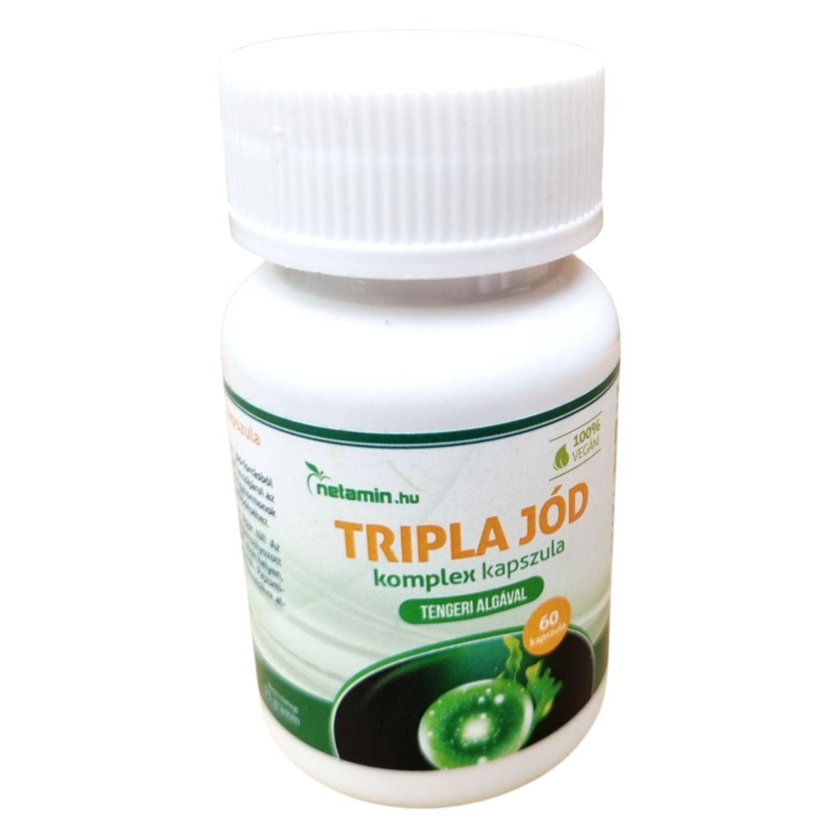 A Netamin Tripla Jód komplex kapszula egy vegán étrend-kiegészítő, amely háromféle jód-forrást tartalmazhat: tengeri alga, nátrium-jodid és kálium-jodid. A jód hozzájárulhat az idegrendszer normál működéséhez, valamint a pajzsmirigyhormonok normál termeléséhez és a pajzsmirigy normál működéséhez. A termék 60 kapszulát tartalmaz, és felnőttek számára napi 1 kapszula fogyasztása ajánlott, lehetőleg étkezés közben. Fontos, hogy az ajánlott napi adagot ne lépje túl, és a termék nem helyettesíti a kiegyensúlyozott vegyes étrendet és az egészséges életmódot. Tárolása száraz, sötét helyen, szobahőmérsékleten, gyermekektől elzárva javasolt.