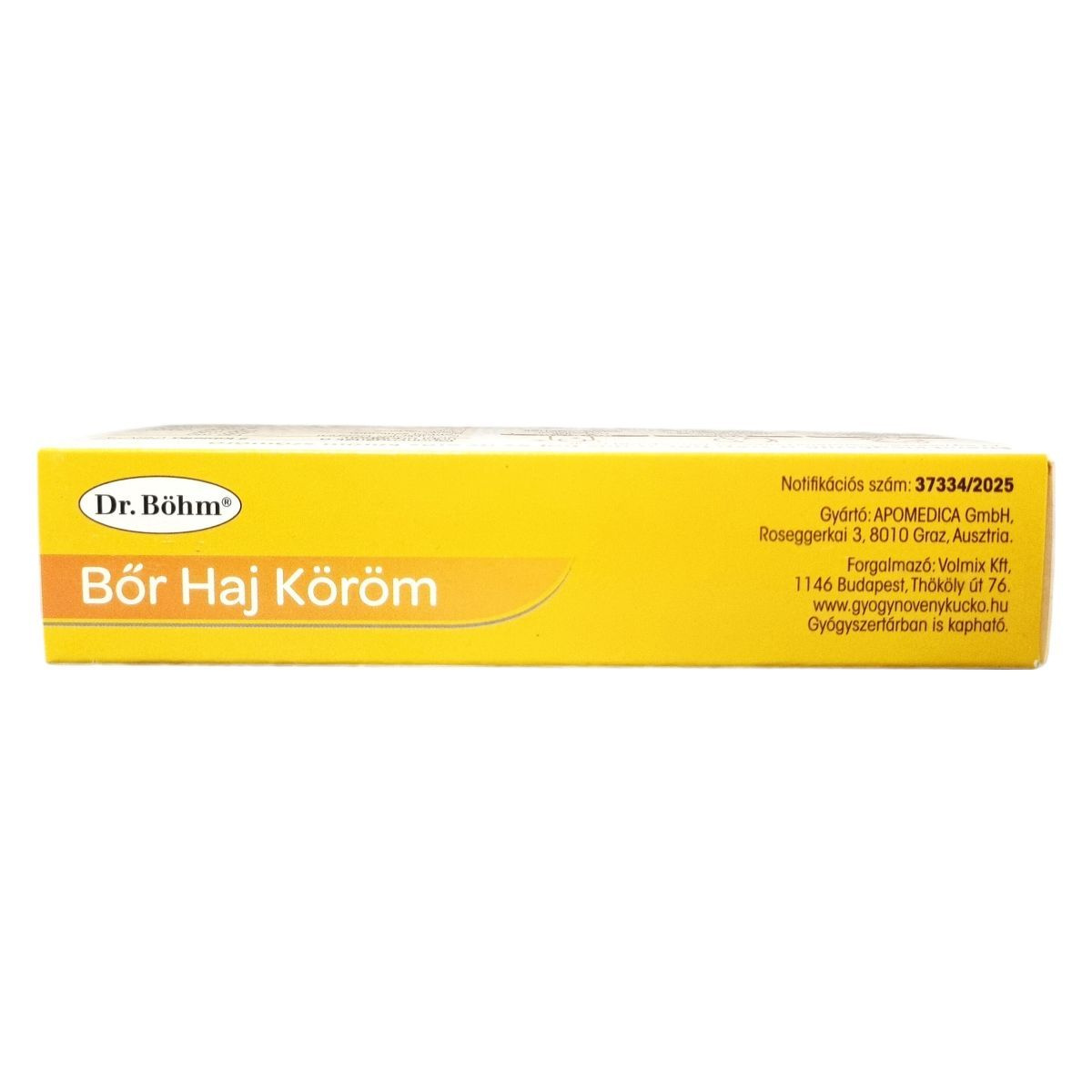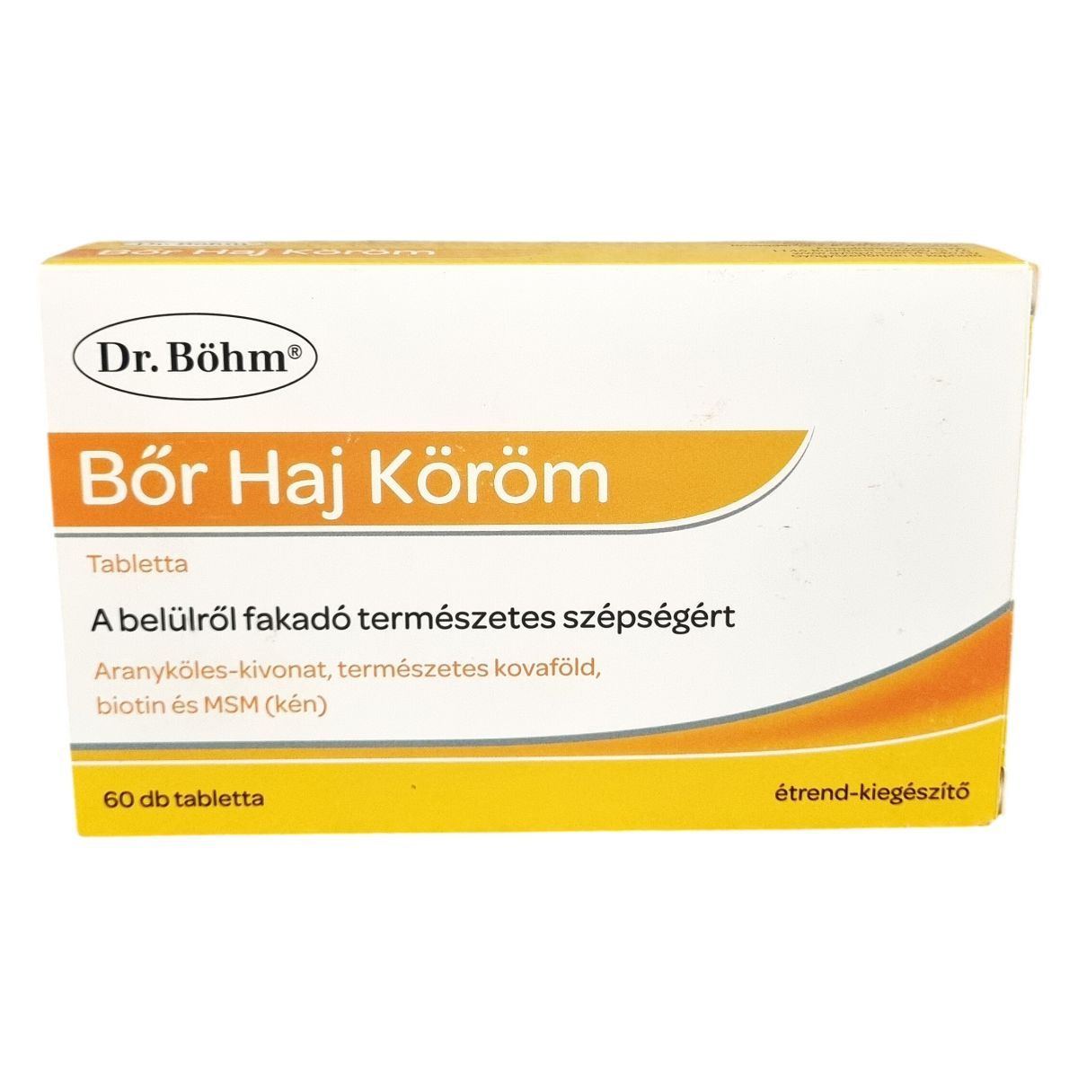 Dr. Böhm® Bőr Haj Köröm tabletta egy olyan étrend-kiegészítő, amelynek célja a bőr, a haj és a köröm egészségének támogatása. Az egyedülálló összetétel aranyköles-kivonatot és természetes kovaföldet tartalmaz, amelyek természetes szilíciumforrásként szolgálnak. A biotin hozzájárulhat az egészséges bőr megőrzéséhez, míg a szelén az egészséges haj fenntartásához, a réz pedig a haj normál pigmentációjához. A cink hozzájárulhat a köröm egészségéhez. A tabletták emellett metil-szulfonil-metánt (MSM) is tartalmaznak, amely kénforrás lehet. Az étrend-kiegészítő formában található vitaminok és ásványi anyagok napi adagja biztosítani tudja a szervezet számára szükséges tápanyagokat. A termék laktóz- és gluténmentes, így széles körben alkalmazható. A megfelelő hatás elérése érdekében ajánlott legalább három hónapon keresztül naponta kétszer bevenni egy tablettát, majd igény szerint folytatni a szedést.