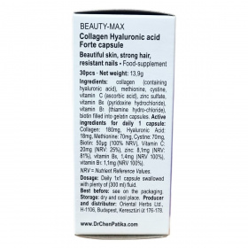 A kollagén és a hialuronsav a bőr fontos szerkezeti felépítői lehetnek. A C-vitamin hozzájárulhat a megfelelő kollagénképződéshez, amely elősegítheti a bőr normál állapotának fenntartását. A cink és a biotin hozzájárulhat a bőr és a haj egészséges állapotának támogatásához, emellett a cink részt vehet a köröm normál állapotának megőrzésében, és szerepet játszhat a sejtosztódásban valamint az A-vitamin anyagcseréjében. A B1- és B6-vitamin hozzájárulhat az idegrendszer megfelelő működéséhez. A kéntartalmú aminosavak, a metionin és a cisztin a fehérjék építőkövei lehetnek. A termék megbízható minőségben, helyes gyártási gyakorlat szerint készül, hogy megfeleljen a minőségi előírásoknak, és már több mint 30 éve jelen van a fogyasztók bizalmában.