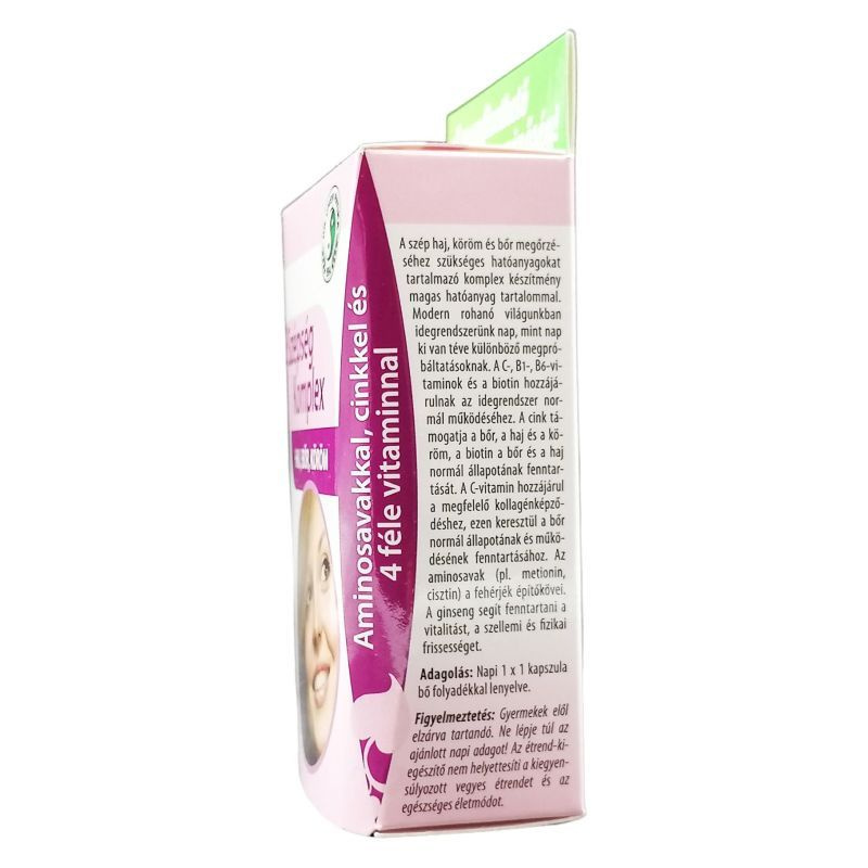 Már naponta 1 kapszulával is ideális a napi szükségletek kielégítéséhez. Modern rohanó világunkban idegrendszerünk nap, mint nap ki van téve különböző megpróbáltatásoknak. A nem kiegyensúlyozott idegállapot azonnal meglátszik bőrünk és hajunk állapotán. A Szépség Komplex kapszulában található aminosavak (metionin, cisztin) a fehérjék építőkövei, a jó minőségű fehérjék a szép bőr, a dús és fényes haj és az erős köröm esszenciális alkotóelemei.