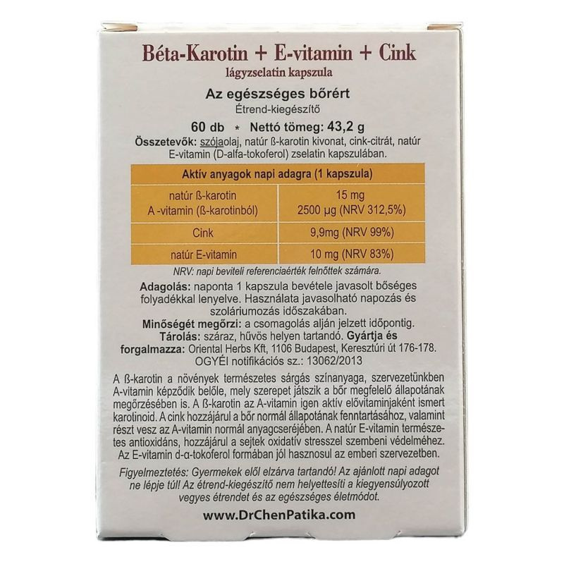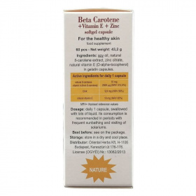 A béta-karotin az A-vitamin igen aktív elővitaminjaként ismert karotinoid. A cink hozzájárul a bőr normál állapotának fenntartásához, valamint részt vesz az A-vitamin normál anyagcseréjében. A natúr E-vitamin természetes antioxidáns, hozzájárul a sejtek oxidatív stresszel szembeni védelméhez. Az E-vitamin d-?-tokoferol formában jól hasznosul az emberi szervezetben. Ajánlott adagolás: napi 1 kapszula bőséggel folyadékkal lenyelve.