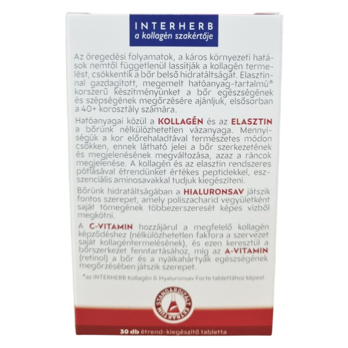 Az INTERHERB Kollagén Hyaluronsav Elasztin Forte tabletta egy korszerű, megemelt hatóanyag-tartalmú készítmény, amelyet a bőr egészségének és szépségének megőrzésére ajánlanak, különösen a 40+ korosztály számára. A termék kollagént, elasztint és hyaluronsavat tartalmaz, amelyek a bőr vázanyagaként fontos szerepet játszhatnak a bőr szerkezetének és hidratáltságának fenntartásában. A C-vitamin hozzájárulhat a megfelelő kollagén képződéshez, míg az A-vitamin a bőr és a nyálkahártyák egészségének megőrzésében játszhat szerepet. Az összetevők között található hidrolizált kollagén kivonat szarvasmarha eredetű, és a termék elsődleges összetevője Argentínából származik.