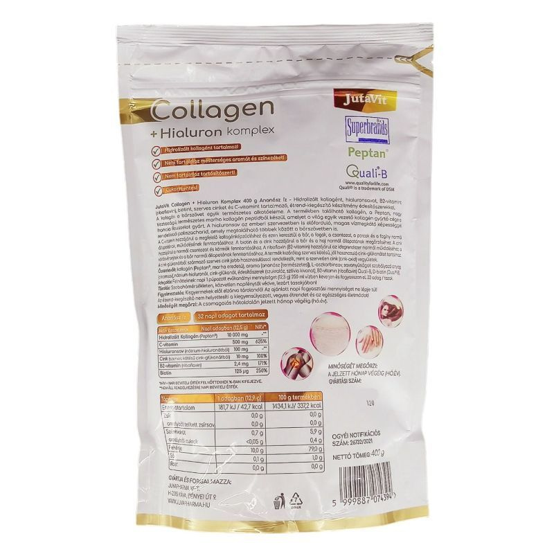 Hidrolizált kollagént, hialuronsavat, B2-vitamint (riboflavin), biotint, szerves cinket, C és D3-vitamint, csipkebogyó kivonatot tartalmazó, étrend-kiegészítő készítmény édesítőszerekkel. Ananász íz.