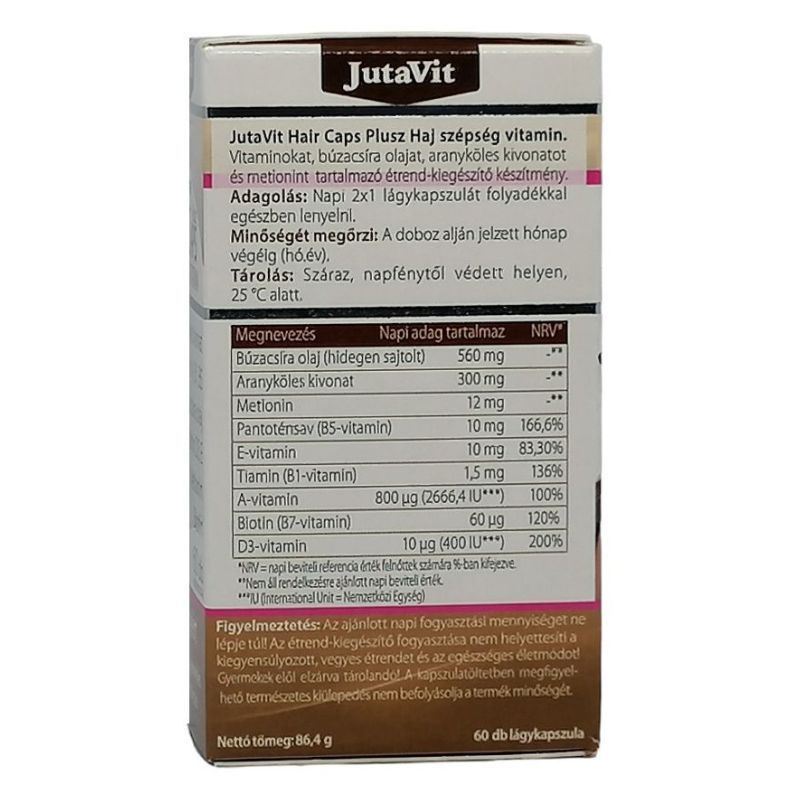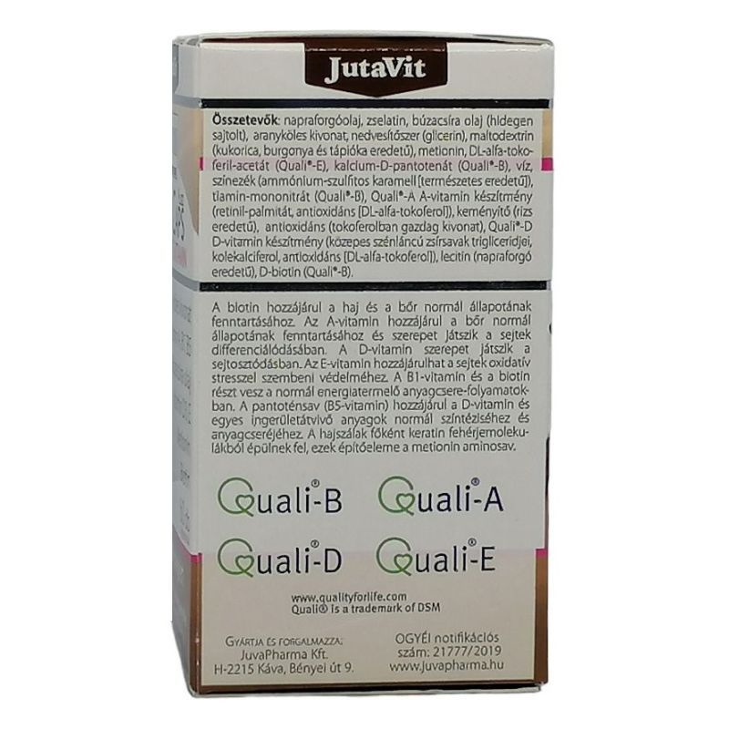 A B5 vitamin (más néven pantoténsav) hozzájárulhat a hajképzésben résztvevő sejtek energiatermelő folyamataihoz. A hajszálak főként keratin nevű fehérjemolekulákból épülnek fel, ezek építőelemei a cisztin és a metionin aminosavak. Adagolás: napi 2x1 kapszulát folyadékkal egészben lenyelni. Tárolás: Szobahőmérsékleten, közvetlen napfénytől védve, saját dobozában! Figyelmeztetés: az ajánlott napi fogyasztási mennyiséget ne lépje túl, az étrend-kiegészítő nem helyettesíti a kiegyensúlyozott vegyes étrendet, és az egészséges életmódot. Kisgyermekek elől elzárva tárolandó. A köles, a cisztin és a B5 vitamin kombinációja segítik az egészséges haj, köröm növekedést és a hajgyökerek anyagcseréjét. A búzacsíra olaj javítja a bőr állapotát, rugalmasságát és feszességét, és elősegíti a természetes bőrsejtek megújulását. Természetes módon hidratálja a bőrt, normalizálva a nedvesség szintjét. A biotin a természetes hajnövekedési folyamat egyik fő komponense. Hozzájárul a haj természetes növekedéséhez, megújulásához. Napi adag tartalmaz: Arany köles kivonat 150mg, RDA % -, Búzacsíra olaj 300mg, RDA % -, B1 vitamin 1,5mg, RDA % 136, B5 vitamin 12mg, RDA % 200, Biotin (H vitamin) 60mcg, RDA % 120, Cisztin 100mg, RDA % -, Metionin 100mg, RDA % -. RDA % = Felnőttek számára ajánlott napi bevitel. Összetevők: Szójaolaj, zselatin, arany köles kivonat, búzacsíra olaj, nedvesítőszer (glicerin), biotin (H), cisztin, metionin, tisztított víz, pantoténsav (B5), színezék (titan dioxid, sárga vas oxid), tiamin (B1).