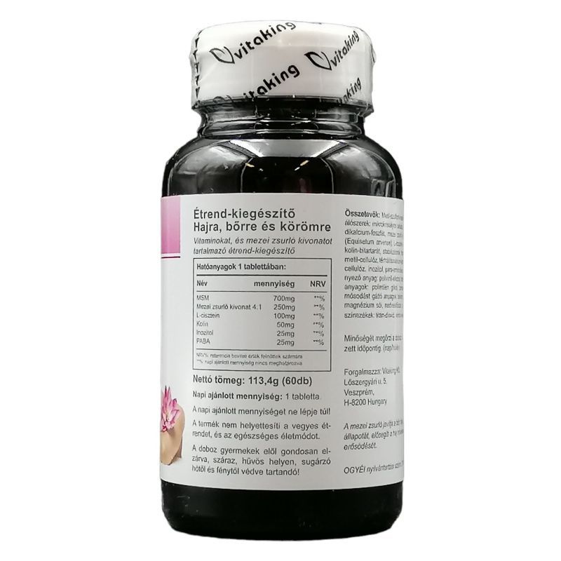 Tartalmaz többek között B10-vitamint, vagy más néven Paba-t, kolint, inozitolt, l-cysteint, mezei zsurlót és MSM-et is.
