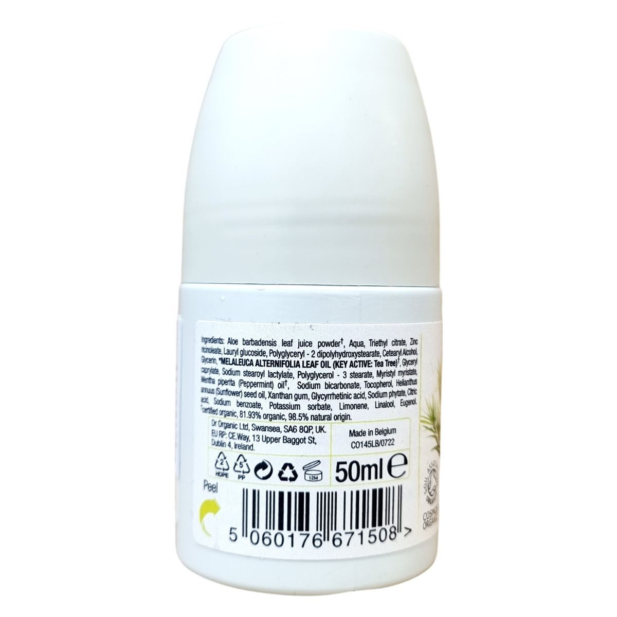 Ez a dr.organic® Tea Tree golyós dezodor 50 ml-es kiszerelésben tisztítja és felfrissíti a bőrt, miközben hatékony természetes dezodoráló hatóanyagokat tartalmaz. A termék vegán, és fő aktív összetevője a bio teafaolaj, amely ismert antibakteriális és frissítő hatásáról. Használata egyszerű, roll-on formában érkezik, felvitel után hagyni kell megszáradni, mielőtt öltözködünk. Az összetétel 81,93%-ban bio és 98,5%-ban természetes eredetű anyagokat tartalmaz, így támogatja a természetes bőrápolást. A termék biztonsági előírásai értelmében kerülni kell a sérült vagy irritált bőrfelületre való felvitelt, és ha bőrirritáció lép fel, a használatot abba kell hagyni. A gyártás Belgiumban történt, a csomagoláson magyar nyelvű használati utasítás is található.