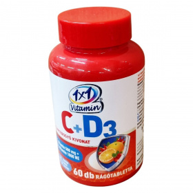 A 1x1 Vitamin C+ D3 + Csipkebogyó kivonat rágótabletta 500 mg C-vitamint, 1000 NE D3-vitamint (25 µg) és 12 mg csipkebogyó kivonatot tartalmaz tablettánként. A C- és D3-vitaminok hozzájárulhatnak az immunrendszer normál működéséhez. A készítmény narancsízű és édesítőszereket is tartalmaz, mint a szorbit, szukralóz és szacharin. A csomósodást gátló anyagok, stabilizátor és természetes aromák biztosítják a rágótabletta minőségét és ízét. A termék nettó tömege 75 g (60 db 1250 mg-os rágótabletta). Az EU-ban készült, az IP361392 jelzéssel ellátott étrend-kiegészítő táplálék-kiegészítőként alkalmazható, az ajánlott adag betartása mellett, kiegyensúlyozott étrend és egészséges életmód részeként.