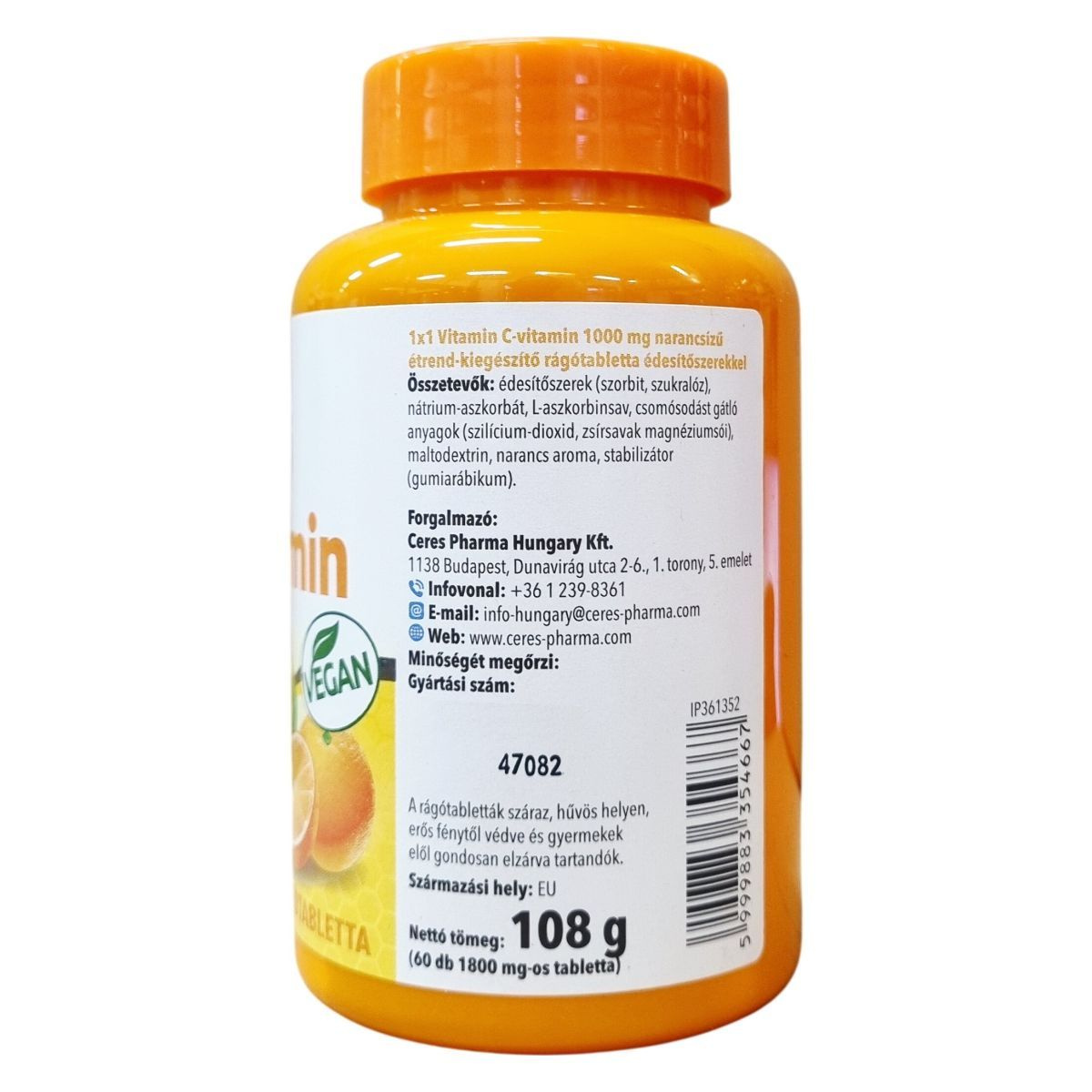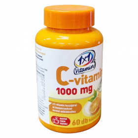 Az 1x1 Vitamin C-vitamin rágótabletta 1000 mg C-vitamint tartalmaz, amely hozzájárulhat az immunrendszer normál működéséhez. A termék narancsízű és édesítőszereket (szorbit, szukralóz) tartalmaz, és csomósodást gátló, stabilizáló anyagokat alkalmaznak az összetételében. Nettó tömege 108 g, amely 60 db rágótablettát tartalmaz. Az összetevők között szerepelnek továbbá maltodextrin, narancs aroma, gumiarábikum. A termék származási helye az Európai Unió. A rágótabletták fogyasztása során ajánlott az adagolási előírásokat betartani és a terméket gyermekektől elzárva tárolni.