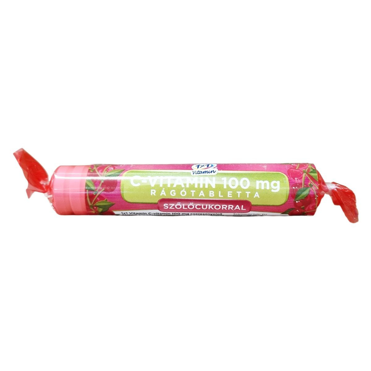 Az 1x1 Vitamin C-vitamin 100 mg rágótabletta szőlőcukorral cseresznye ízű étrend-kiegészítő, amely C-vitamint tartalmaz. A termék nettó tömege 39,1 g, ami 17 db 2,3 g-os tablettát foglal magában. Az egy tabletta napi ajánlott adagját 100 mg C-vitamin biztosítására állították össze, ami a felnőttek számára ajánlott napi táplálkozási referenciaérték 125%-a. A készítmény összetevői között megtalálhatóak a dextróz, L-aszkorbinsav, a csomósodást gátló anyag zsírsavak magnéziumsói formájában, maltodextrin, gumiarábikum és természetes cseresznye aroma. Tápértékadatok szerint 100 g termék energiatartalma 1539 KJ (362 kcal), amely egy tablettára vetítve 35,4 KJ (8,33 kcal). A zsír tartalma 0,95 g/0,02 g, ebből telített zsírsav 0,95 g/0,02 g. Szénhidrát 84,8 g/1,95 g, amelyből cukor 83,9 g/1,93 g. A termék nem tartalmaz poliolokat, rostot, fehérjét és sót. A csomagoláson feltüntetett minőségmegőrzési idő alatt javasolt a termék használata. A gyártás az Európai Unió területén történt.