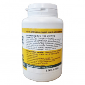 A VITA CRYSTAL RESEARCH ALOE kapszula egy 100 darabos kiszerelésű étrend-kiegészítő, amely összetett bioflavonoid komplexből és aloe vera porból áll. A Flavin 7 bioflavonoid komplex többféle gyümölcshéj és mag szárítmányát tartalmazza, emellett kendermag őrleményt és növényi alapú kapszulát használ. A termék az ajánlott adagban aloe vera szárított port, összes polifenolt, flavonoidokat és resveratrolt biztosít, amelyek hozzájárulhatnak az antioxidáns hatások támogatásához. Felhasználáskor 1 kapszula ajánlott napi bevitelként, szükség esetén maximum 2 kapszula. A kapszulákat bő vízzel kell lenyelni, és a terméket kisgyermekektől el kell zárni, továbbá fontos, hogy az étrend-kiegészítőt ne tekintsük a kiegyensúlyozott étrend vagy az egészséges életmód helyettesítőjének. A termék száraz, hűvös helyen tárolandó.
