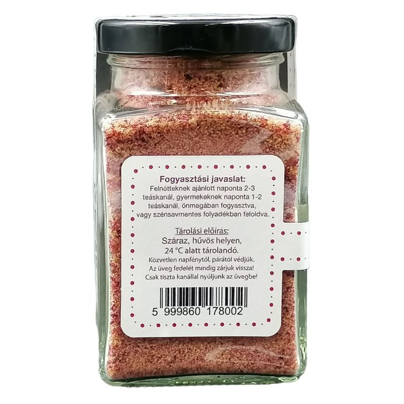 Gyümölcsalapú szuperkoncentrátum csipkebogyóval, bodzával és fekete bodzával, kristályos formában. Hozzáadott cukrot nem tartalmaz, vegán étrendbe is beilleszthető.