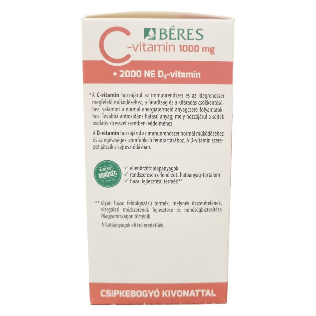 A Béres C-vitamin 1000 mg + 2000 NE D3-vitamin retard filmtabletta csipkebogyó kivonattal étrend-kiegészítő készítmény, melynek egy filmtablettája 1000 mg C-vitamint, 50 µg (2000 NE) D3-vitamint és 25 mg csipkebogyó száraz kivonatot tartalmaz, utóbbi 2:1 drog:extraktum arányban. A C-vitamin hozzájárulhat az immunrendszer és az idegrendszer megfelelő működéséhez, a fáradtság és a kifáradás csökkentéséhez, továbbá a normál energiatermelő anyagcsere-folyamatokhoz. Emellett antioxidáns hatású anyagként a sejtek oxidatív stresszel szembeni védelmét támogathatja. A D-vitamin az immunrendszer normál működésében és az egészséges izomfunkció fenntartásában játszhat szerepet, valamint részt vehet a sejtosztódás folyamatában. A termék ellenőrzött alapanyagokból és rendszeresen ellenőrzött hatóanyag-tartalommal készül, hazai fejlesztésű készítményként. Alkalmazása javasolt többek között egyoldalú, vitaminhiányos táplálkozás esetén, fokozott vitamin-szükséglet idején, betegségeket követő felépülés során, valamint fáradtság és jelentős fizikai igénybevétel időszakában.