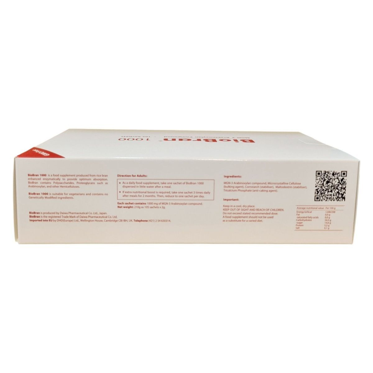 A BioBran 1000 egy Japánban gyártott étrend-kiegészítő, amely rizskorpából készül, és enzimatikusan fejlesztették ki az optimális felszívódás érdekében. A termék poliszacharidokat, proteoglikánokat, például arabinoxilánt és más hemicellulózokat tartalmazhat. A BioBran 1000 vegetáriánusok számára is alkalmas, és nem tartalmaz genetikailag módosított összetevőket. A terméket az EU-ba a DHD(Europe) Ltd. importálja. A termék 105 tasakot tartalmaz, mindegyik tasak 1000 mg MGN-3 Arabinoxylan vegyületet tartalmaz. A termék használata során fontos, hogy ne lépje túl az ajánlott adagot, és ne használja a változatos étrend helyettesítésére.