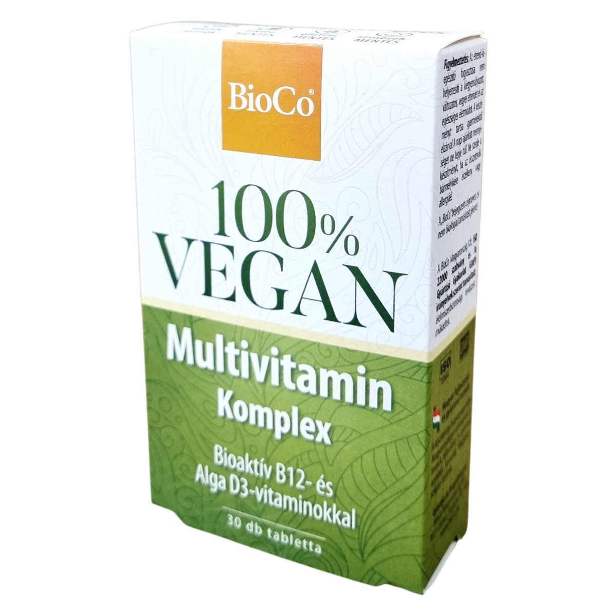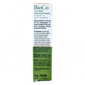 A BioCo 100% VEGAN Multivitamin Komplex készítmény a vegán életmódot követők számára készült. A termék a létező 13 vitaminból 11-et tartalmaz, kiemelten magas dózisban bioaktív, természetes metilkobalamin formájú B12-vitaminnal, valamint algából nyert D3-vitaminnal. A készítmény tökéletes kiegészítője a BioCo 100% VEGAN Alga Kalcium & Tengeri Magnézium terméknek. Magyar fejlesztésű és gyártású termék, ISO 22000 és Jó Gyártási Gyakorlat (GMP) szerint tanúsított élelmiszerbiztonsági rendszerben készül.