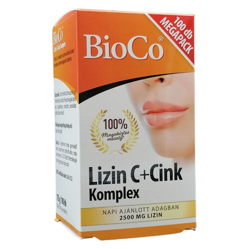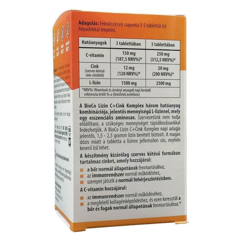 A BioCo Lizin C+Cink Komplex három hatóanyag kombinációja, jelentős mennyiségű L-lizinnel, mely egy esszenciális aminosav. Szervezetünk nem tudja előállítani, így a szükséges mennyiséget táplálkozásunkkal fedezhetjük. A BioCo Lizin C+Cink Komplex napi adagja jelentős, 1,5-2,5 g lizin bevitelt biztosít. A magas dózis miatt a tabletta a lizinre jellemzően sós, enyhén keserű ízű lehet.