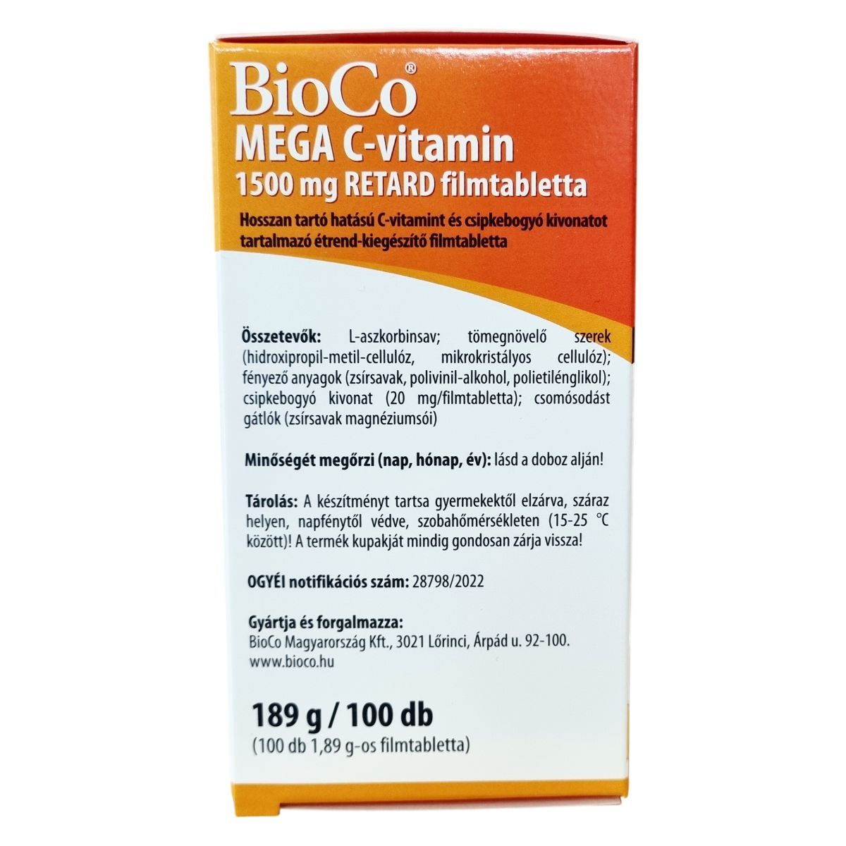 A termék a legmagasabb hatóanyag-tartalmú BioCo C-vitamin filmtabletta, mely 1500 mg C-vitamint tartalmaz. A retard hatás révén a C-vitamin fokozatosan szabadul fel a szervezetben, így folyamatosan támogatni tudja a szervezet C-vitamin szükségletét. A készítmény csipkebogyó kivonatot is tartalmaz. Fogyasztása különösen ajánlott a tavaszi és téli időszakban, kimerültség, fáradtság esetén, fokozott C-vitamin szükséglet idején, az immunrendszer támogatására, illetve betegség utáni felépülési szakaszban. A termék magyar fejlesztésű és gyártású, hatóanyaga külföldről származik, de előállítása kizárólag Magyarországon történik. Az új, színezékmentes nyeléskönnyítő bevonat jól látható hatóanyagszemcséket tartalmaz.