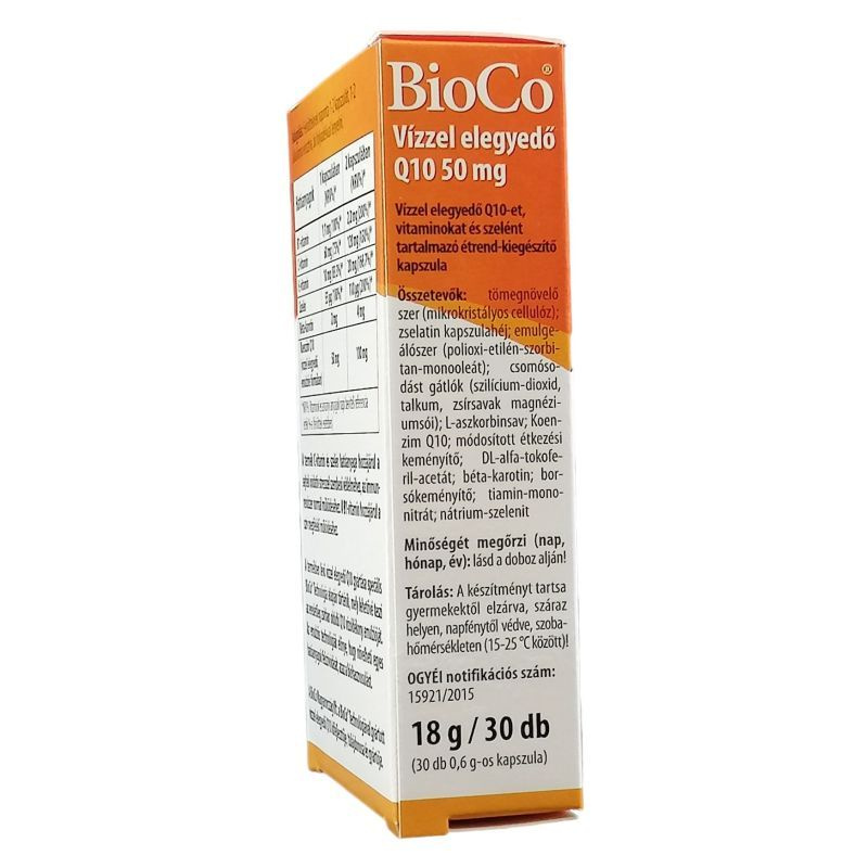 Az emulziós technológiák előnye, hogy növelheti egyes hatóanyagok felszívódását, azaz a biohasznosulást. A BioCo Magyarország Kft. a BioCo Technológiával gyártott vízzel elegyedő Q10 kifejlesztője, tulajdonosa és gyártója. Adagolás: naponta 1-2 kapszulát, 1-2 alkalomra elosztva, bő folyadékkal lenyelni. Hatóanyagok 1 kapszulában: Vízzel elegyedő Koenzim Q10: 50 mg, B1-vitamin: 1,1 mg (100%)*, C-vitamin: 60 mg (75 NRV%)*, E-vitamin: 10 mg (83,3 NRV%)*, Béta-karotin: 2 mg, Szelén: 55 µg (90,9 NRV%)* *NRV%: napi beviteli referencia érték %-a felnőttek esetében.