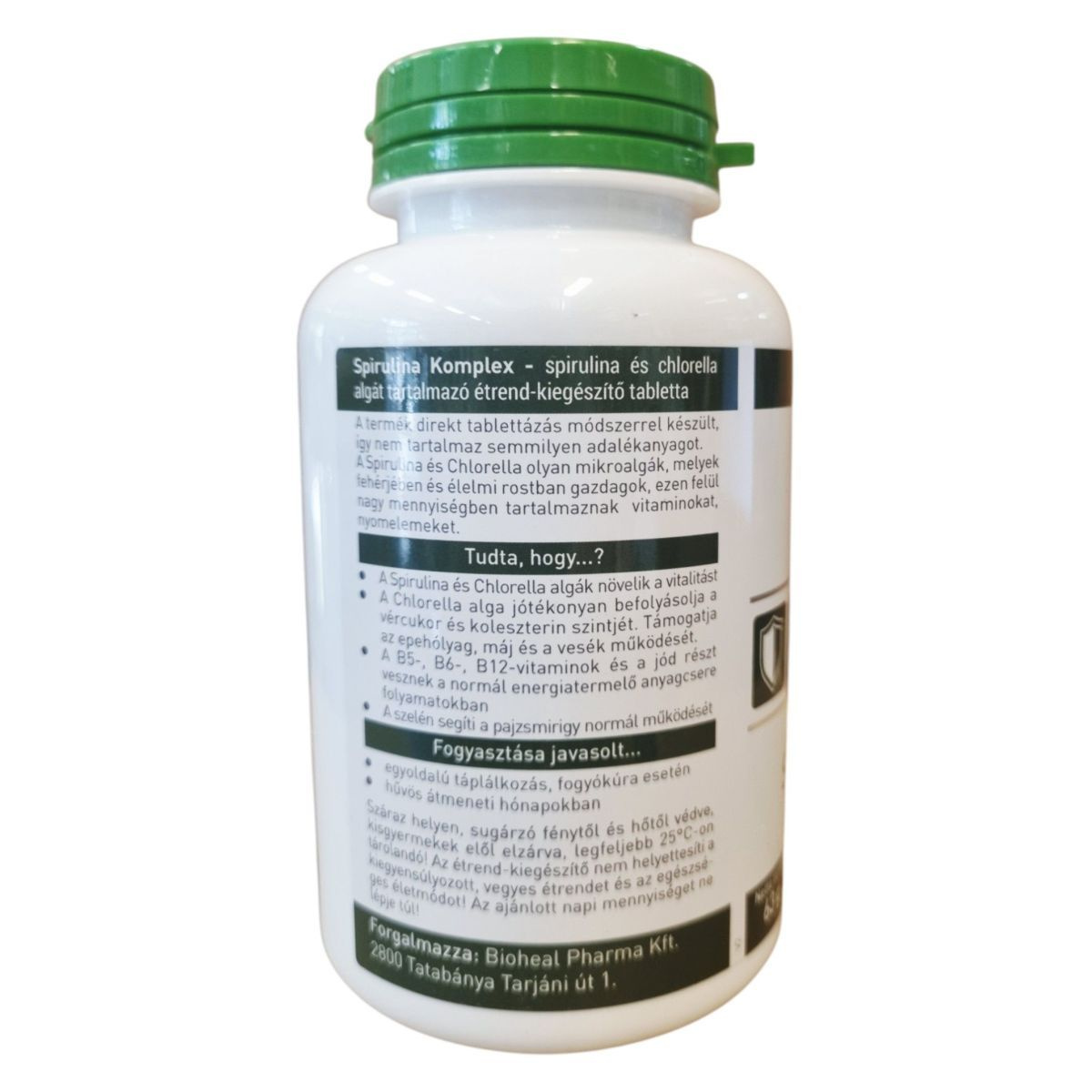 A Spirulina Komplex egy adalékanyag-mentes étrend-kiegészítő, amely spirulina és chlorella algát tartalmaz. Ezek a mikroalgák fehérjében és élelmi rostban gazdagok lehetnek, és nagy mennyiségben tartalmazhatnak vitaminokat, nyomelemeket. A termék fogyasztása javasolt lehet egyoldalú táplálkozás vagy fogyókúra esetén, valamint stresszes időszakokban. A B5-, B6-, B12-vitaminok és a jód hozzájárulhatnak a normál energiatermelő anyagcsere folyamatokhoz, míg a szelén támogathatja a pajzsmirigy normál működését.
