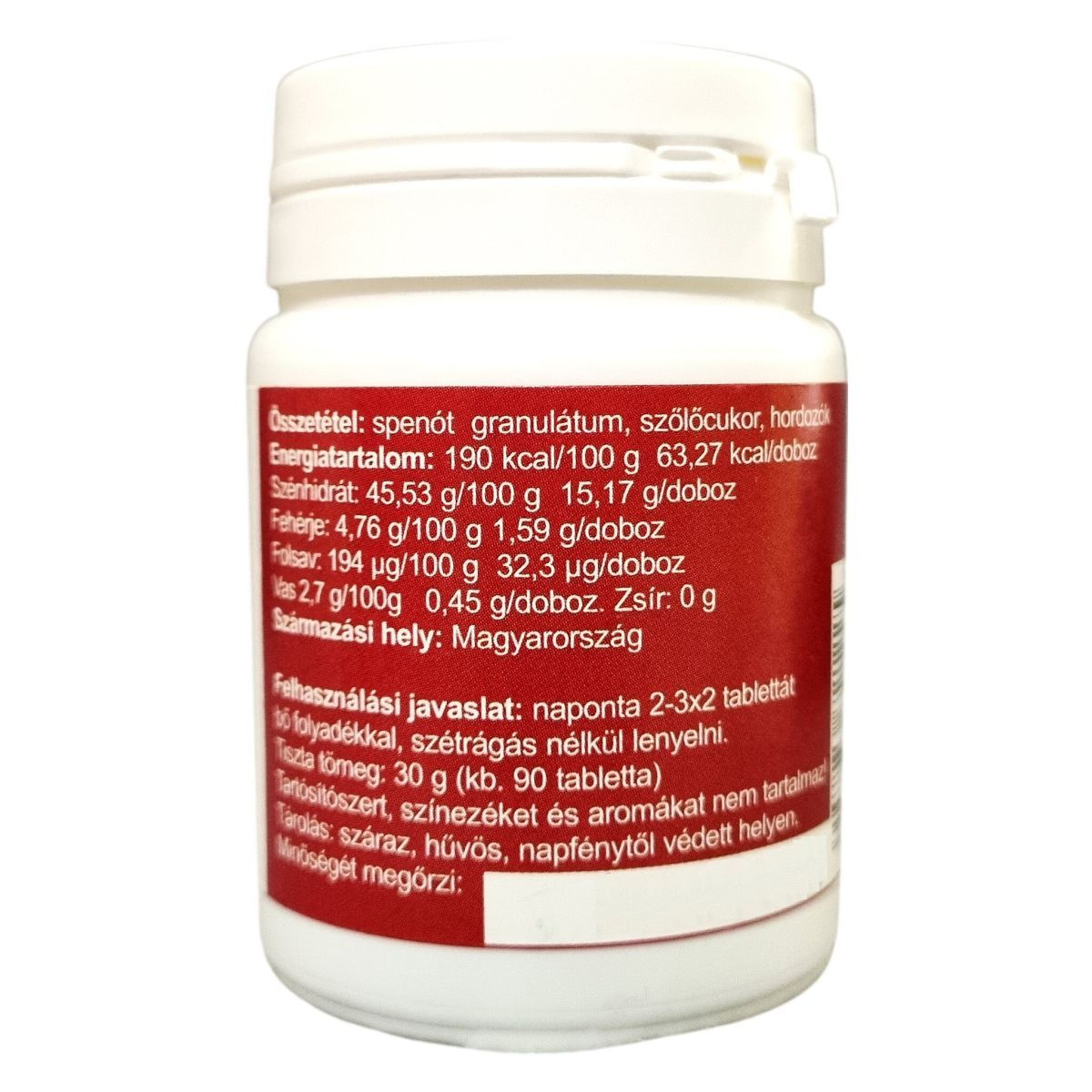 A termék tiszta tömege 30 g, körülbelül 90 tablettát tartalmaz. Tartósítószereket, színezékeket és aromákat nem tartalmaz, így természetes összetevőinek köszönhetően ideális választás lehet azoknak, akik természetes vas- és folsavpótlásra törekednek. Származási helye Magyarország.