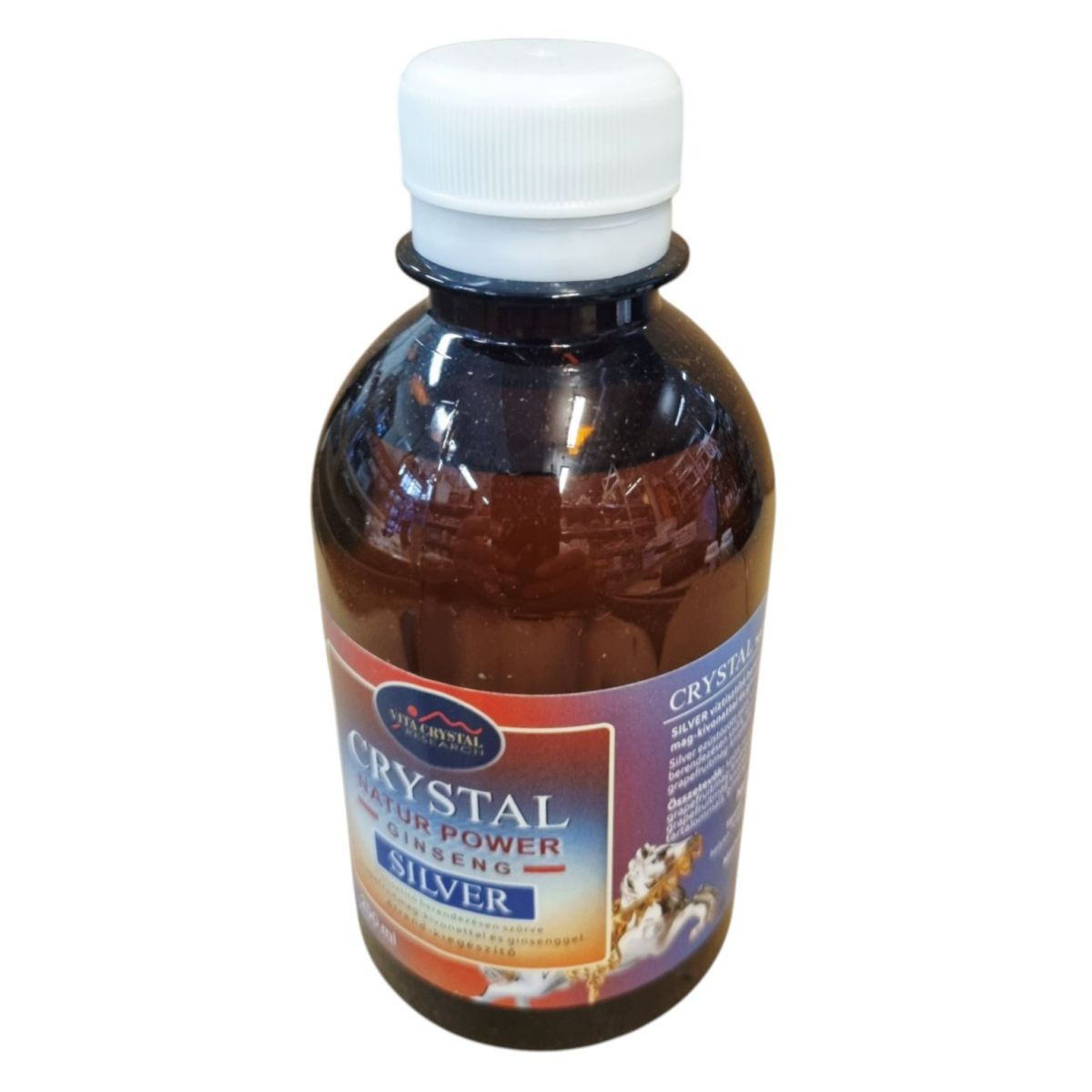 A CRYSTAL NATUR POWER GINSENG SILVER egy speciális étrend-kiegészítő, amely grapefruitmag- és ginzeng-kivonatot tartalmaz. A termék víztisztító berendezésen szűrt, reverse ozmossal tisztított víz alapú, amely ezüstözött aktív szén töltettel van ellátva. A grapefruitmag-kivonat citrus bioflavonoidokat tartalmazhat, amelyek antioxidáns hatásúak lehetnek, míg a ginzeng-kivonat ginsenoside-okat tartalmazhat, amelyek hozzájárulhatnak az energiaszint fenntartásához. A termék 200 ml-es kiszerelésben kapható, és javasolt napi fogyasztása 20-50 ml. Fontos, hogy az ajánlott napi mennyiséget ne lépje túl, és a termék nem helyettesíti a kiegyensúlyozott étrendet és az egészséges életmódot.