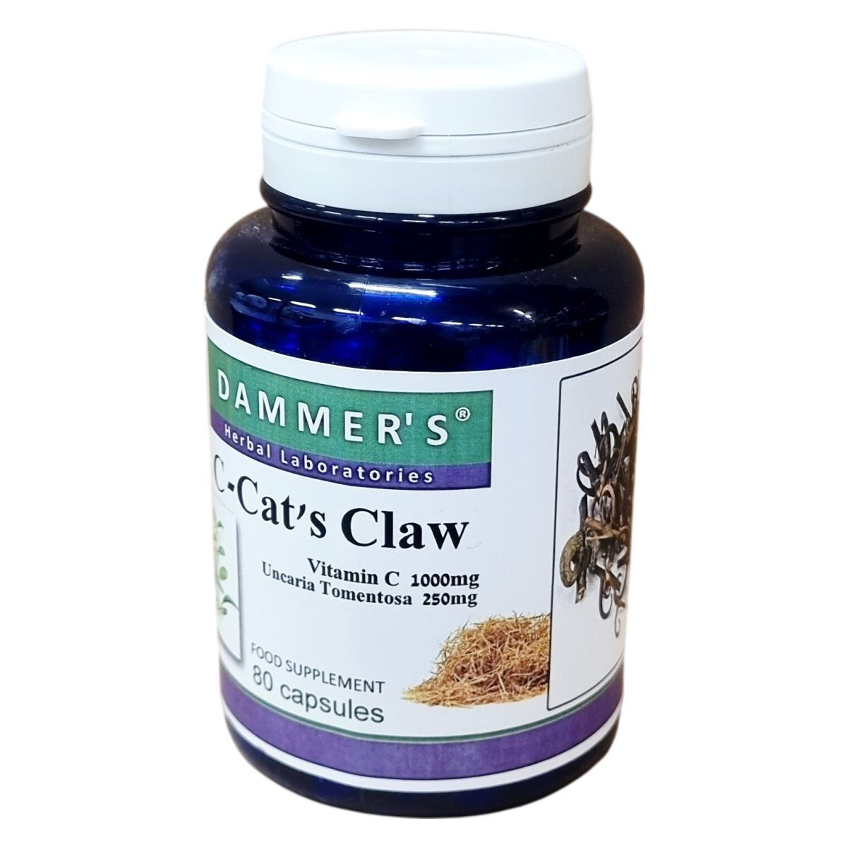 A Dammer's Herbal Laboratories terméke, a C-Cat's Claw, egy vitamin C-t és Macskakarom (Uncaria Tomentosa) kivonatot tartalmazó étrend-kiegészítő kapszula. A termék 80 darab kapszulás kiszerelésben érhető el, egy adag 2 kapszulát jelent, melyek 2000 mg C-vitamin és 500 mg Macskakarom kivonat hatóanyagot tartalmaznak. A kapszulák zselatin héjjal rendelkeznek, így könnyen lenyelhetők. A készítmény megfelel az étrend-kiegészítők szabályozásának, és bármilyen egészséges életmód részeként alkalmazható, de nem helyettesíti a vegyes táplálkozást. A termék az ajánlott mennyiség betartása mellett használható, gyerekek elől elzárva kell tartani.