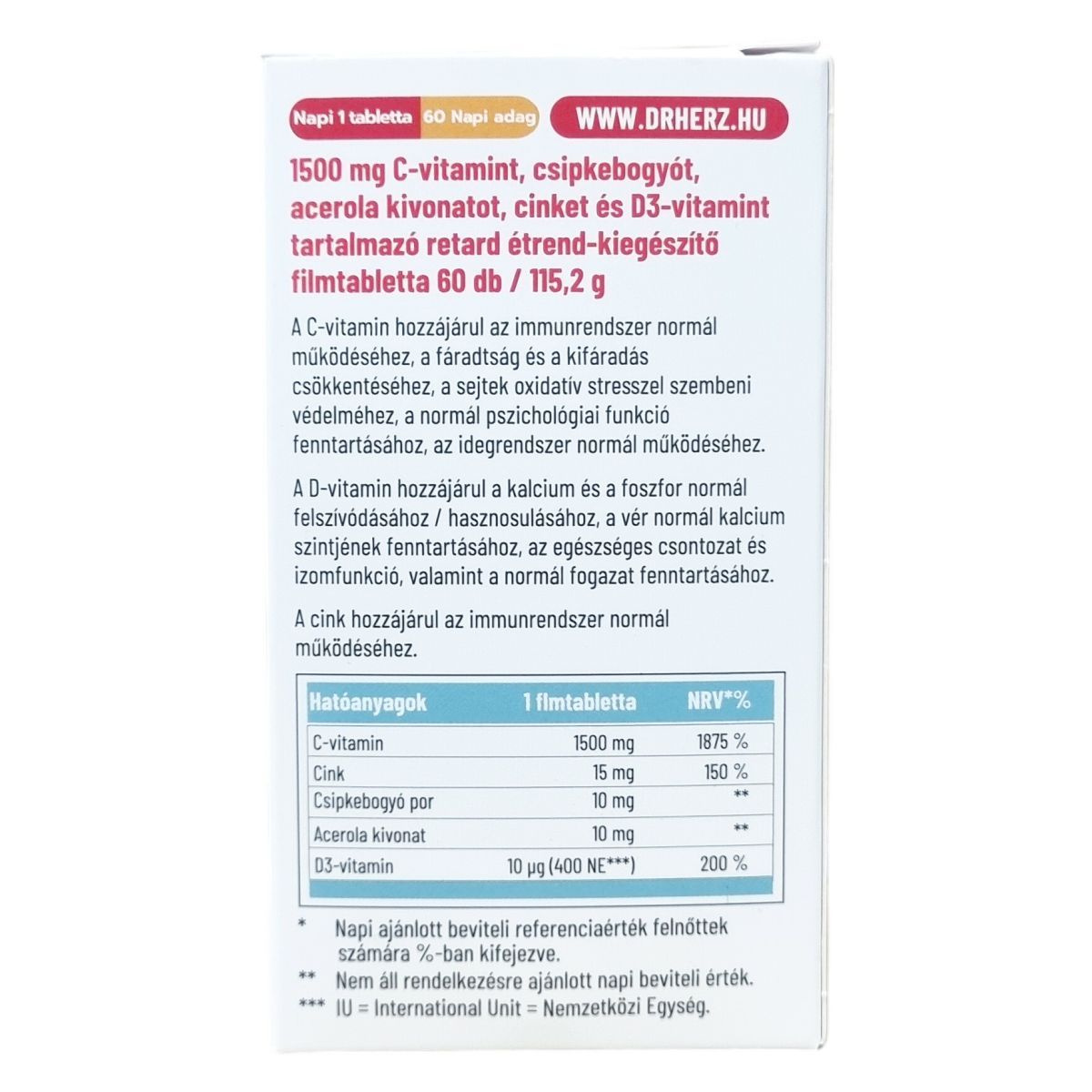 A Dr.Herz® C-vitamin retard filmtabletta 1500 mg C-vitamint, csipkebogyót, acerola kivonatot, cinket és D3-vitamint tartalmaz. A C-vitamin hozzájárulhat az immunrendszer normál működéséhez, a fáradtság és kifáradás csökkentéséhez, a sejtek oxidatív stresszel szembeni védelméhez, a normál pszichológiai funkció fenntartásához és az idegrendszer működéséhez. A D-vitamin hozzájárulhat a kalcium és foszfor normál felszívódásához, a vér normál kalciumszintjének fenntartásához, az egészséges csontozat, izomfunkció és fogazat megőrzéséhez. A cink szintén támogathatja az immunrendszer működését. A termék 60 darab filmtablettát tartalmaz, mely könnyen beilleszthető a napi étrendbe. Termékeit keresheti gyógyszertárakban és gyógynövényboltokban, amelyek között vitaminok, étrend-kiegészítők, oldatos cseppek, hidegen sajtolt olajok, természetes illóolajok és gyógynövényes krémek találhatók, különböző felhasználási területekre, például immunerősítésre, fogyókúrára, méregtelenítésre, emésztésre, szív- és érrendszer támogatására, csontrendszerre, valamint haj, bőr és köröm egészségének támogatására.