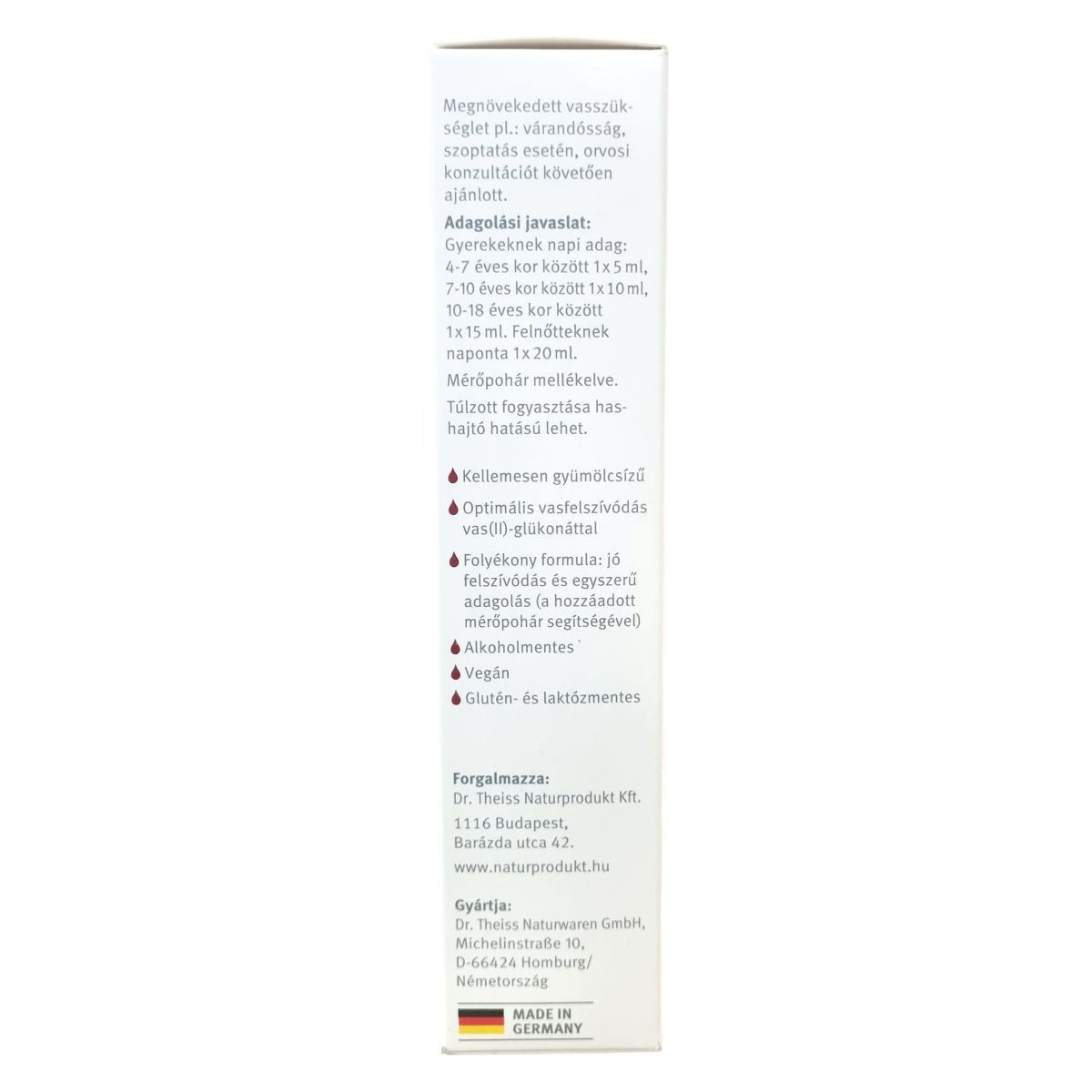 Használat előtt felrázandó! Az esetleges üledék a készítmény minőségét nem befolyásolja. Az étrend-kiegészítő nem helyettesíti a kiegyensúlyozott, vegyes étrendet és az egészséges életmódot. Az ajánlott napi mennyiséget ne lépje túl! Kisgyermekek elől elzárva tartandó! Túlzott fogyasztása hashajtó hatású lehet. Megnövekedett vasszükséglet esetén, például várandósság és szoptatás idején orvosi konzultáció ajánlott.