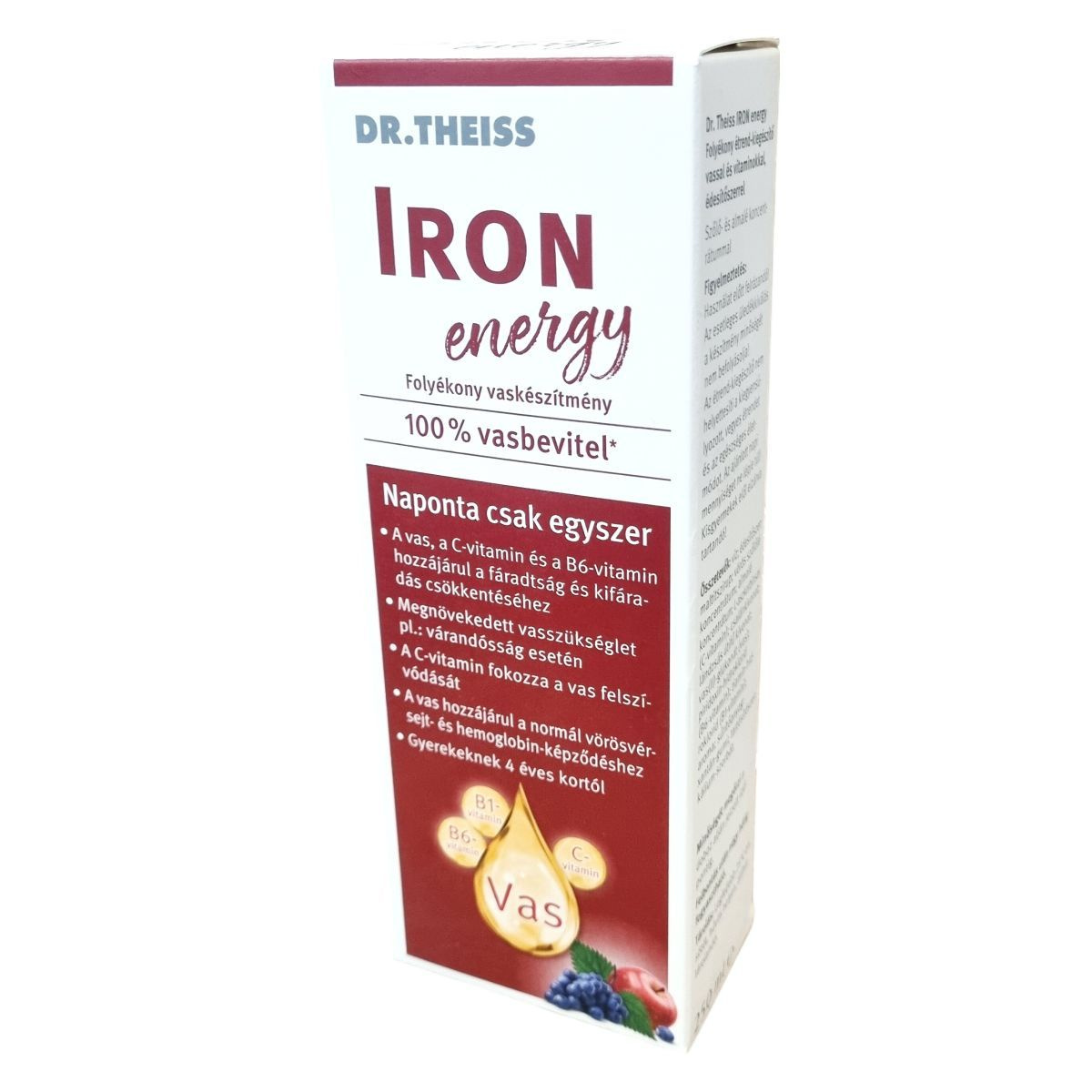 Ez a folyékony étrend-kiegészítő vasat és vitaminokat – B1-, B6- és C-vitamint – tartalmaz, melyek hozzájárulhatnak a normál vörösvérsejt- és hemoglobinképződéshez, a fáradtság és kifáradás csökkentéséhez, valamint az immunrendszer normál működéséhez. Kétértékű vasat tartalmaz, amelynek felszívódását a C-vitamin segíti elő. A hozzáadott gyümölcskoncentrátumok kellemes ízt biztosítanak, a folyékony formula pedig egyszerű adagolást tesz lehetővé a mellékelt mérőpohár segítségével. Az édesítőszerként maltitszirupot használ, alkoholmentes, gluténmentes és laktózmentes készítmény. Megnövekedett vasszükséglet esetén, például várandósság vagy szoptatás alatt, orvosi konzultáció javasolt a használata előtt.
