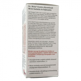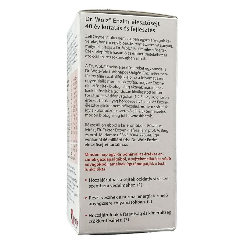 Annak érdekében, hogy az egyes anyagok vitalizáló és antioxidáns hatásukat célzottan, a sejtek szintjén tudják kifejteni, az anyagok szinergikus formában vannak jelen, azaz közös hatásuk nagyobb, mint az egyes hatások külön-külön. Egy evőkanál (10 ml) 66 milliárd Dr. Wolz Enzim-élesztősejtet tartalmaz. A Dr. Wolz Zell Oxygen Plus készítmény természetes alkotórészeinek átfogó kínálatából a szervezet pontosan azokat a tápanyagokat tudja felvenni, amelyek neki hiányoznak. A létfontosságú tápanyagokat tartalmazó Dr. Wolz Enzim-élesztősejteket, természetes úton juttatjuk a szervezetbe. Fogyasszunk minden nap egy kis pohárral az értékes enzimek gazdagságából, a sejteket ellátó és védő anyagokból, amelyek így támogatják a testi funkciókat: Védik sejtjeinket az oxidatív terheléstől, a szabad gyököktől, és támogatják a sejtek energia-anyagcseréjét. A készítmény nem tartalmaz glutént, laktózt zselatint, színezéket és tartósítószereket. A készítmény a természetes erjedési folyamatokból keletkező 12% alkoholt tartalmaz! Gyermekek, várandósok, szoptatós anyák és alkoholbetegek nem fogyaszthatják! Összetevők: Enzim-tartalmú élesztősejtek, gyümölcslé koncentrátum (narancs, ananász, grapefruit, citrom, homoktövis) almalé koncentrátumból, inaktív szárított élesztősejtek, méz, búzacsíra olaj, acerola gyümölcspor, E-vitamin, cinkélesztő, természetes aroma, szelénélesztő, nikotinamid, pantothenat, B12-vitamin, B6-vitamin, B1-vitamin, B2,-vitamin, biotin. Alkalmazási javallat: Ajánlott naponta 10 - 30 ml (1 - 3 teli evőkanál) koncentrátumot hígítva tetszés szerint italban vagy gyümölcslében elkeverve elfogyasztani étkezés előtt vagy étkezés közben (a legjobb ízhatás almalével érhető el), +40°C feletti hőmérsékletű itallal bevenni nem szabad. Használat előtt jól felrázandó! Felbontást követően hűtve tárolandó!